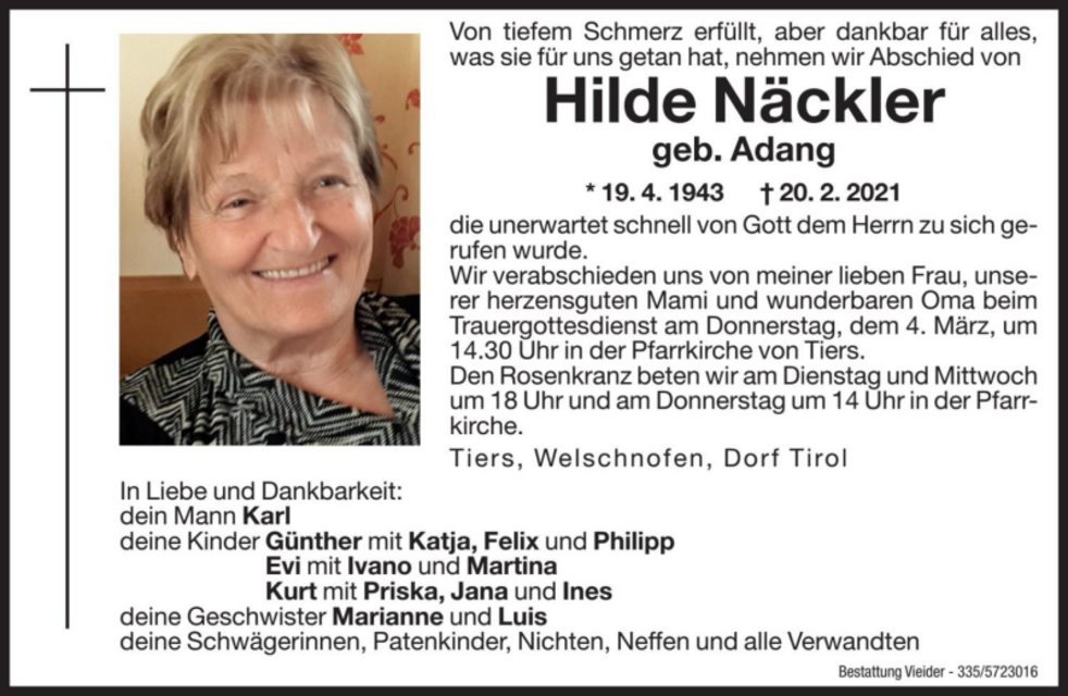 Wir verabschieden uns von meiner lieben Frau, unserer herzensguten Mami und wunderbaren Oma beim Trauergottesdienst am Donnerstag, den 4. März um 14.30 in der Pfarrkirche von Tiers.