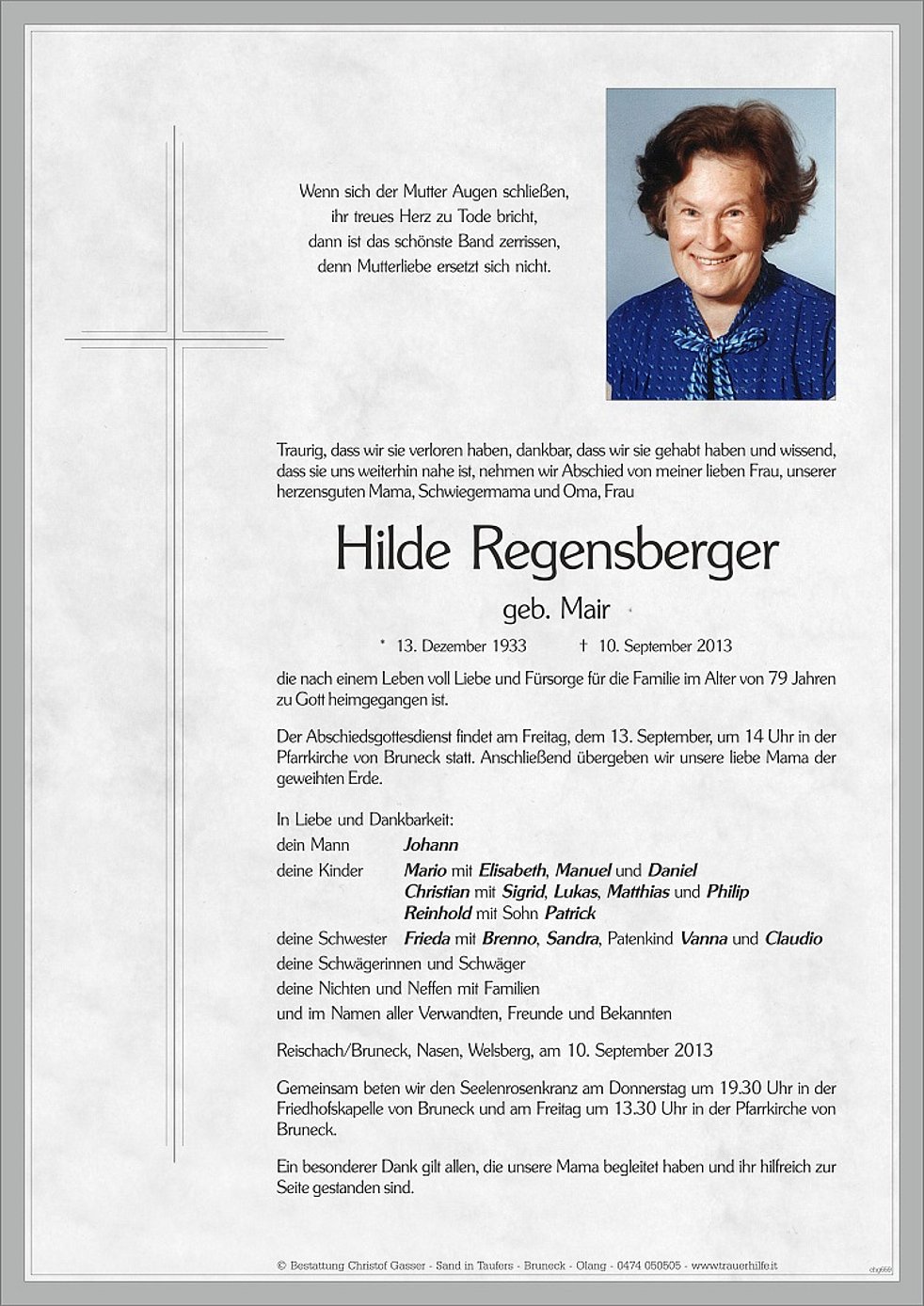 Der Abschiedsgottesdienst findet am Freitag, dem 13. September, um 14 Uhr in der Pfarrkirche von Bruneck statt. Anschließend übergeben wir unsere liebe Mama der geweihten Erde.
