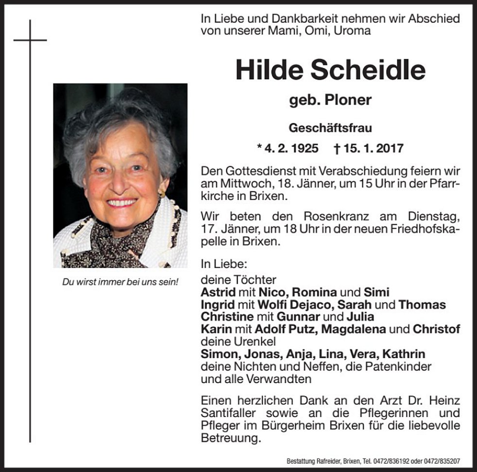 Einen herzlichen Dank an den Arzt Dr. Heinz Santifaller sowie an die Pflegerinnen und Pfleger im Bürgerheim Brixen für die liebevolle Betreuung.