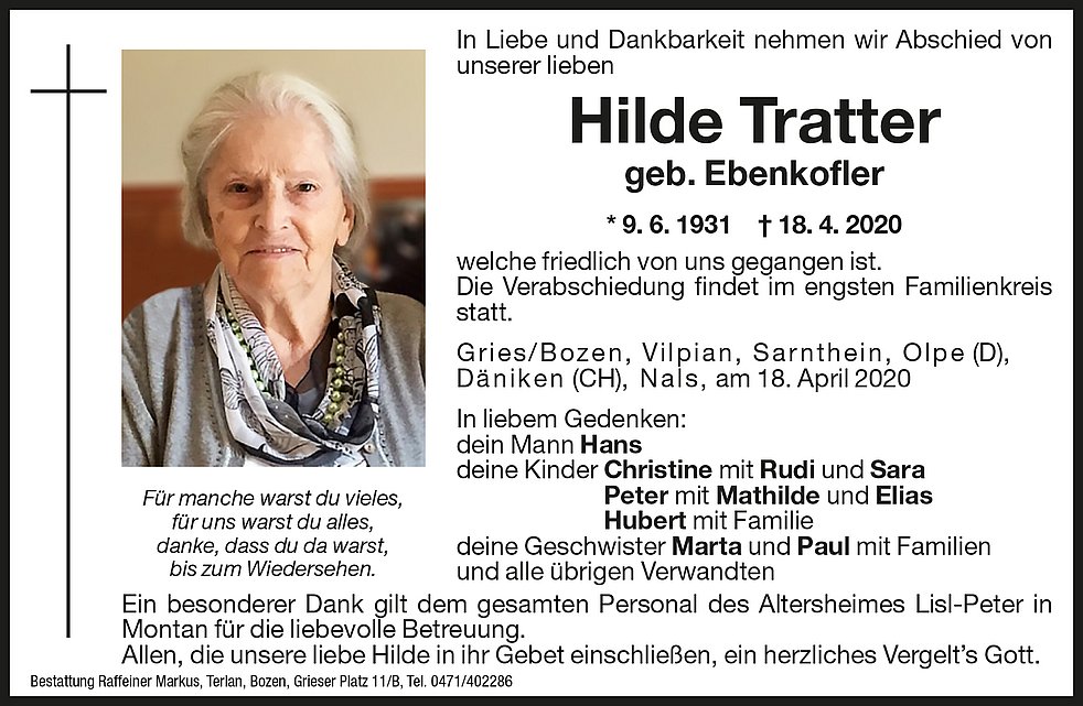Ein besonderer Dank gilt dem gesamten Personal des Altersheimes Lisl-Peter in Montan für liebevolle Betreuung.