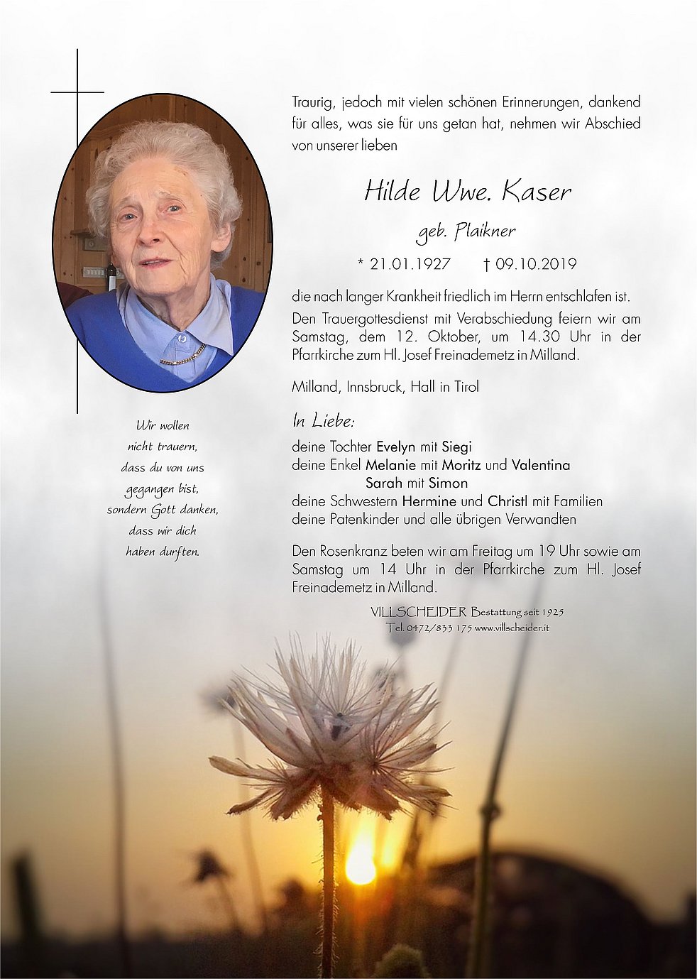 Trauerfeier: 12.10. - 14:30 Uhr Pfarrkirche zum Hl. Josef Freinademetz