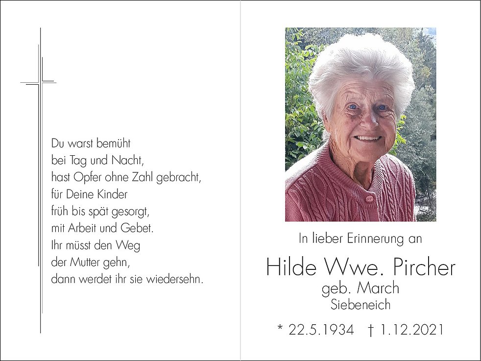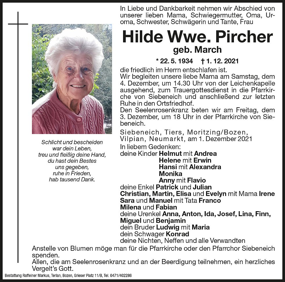 Wir begleiten unsere liebe Mama am Samstag, dem 4. Dezember, um 14.30 Uhr von der Leichenkapelle ausgehend zum Trauergottesdienst in die Pfarrkirche von Siebeneich und anschließend zur letzten Ruhe in den Ortsfriedhof.