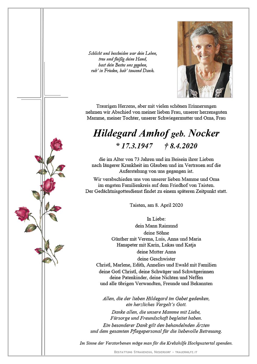 Im Sinne der Verstorbenen möge man für die Krebshilfe Hochpustertal spenden.