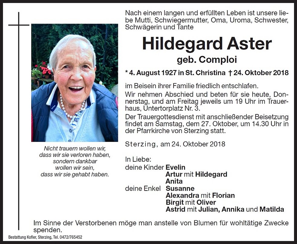 Der Trauergottesdienst mit anschließender Beisetzung findet am Samstag, dem 27. Oktober um 14.30 Uhr in der Pfarrkirche von Sterzing statt.