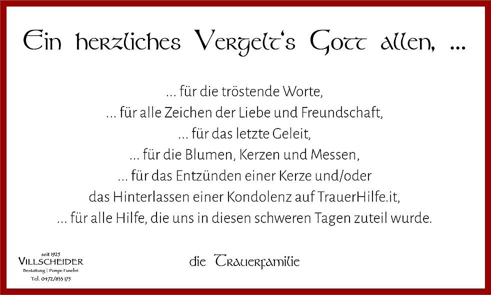 moechte euch hiermit mein aufrichtiges Beileid zum Verlust eurer geliebten Mutter -Frau - Oma aussprechen und euch viel Kraft wünschen in dieser schweren Zeit.