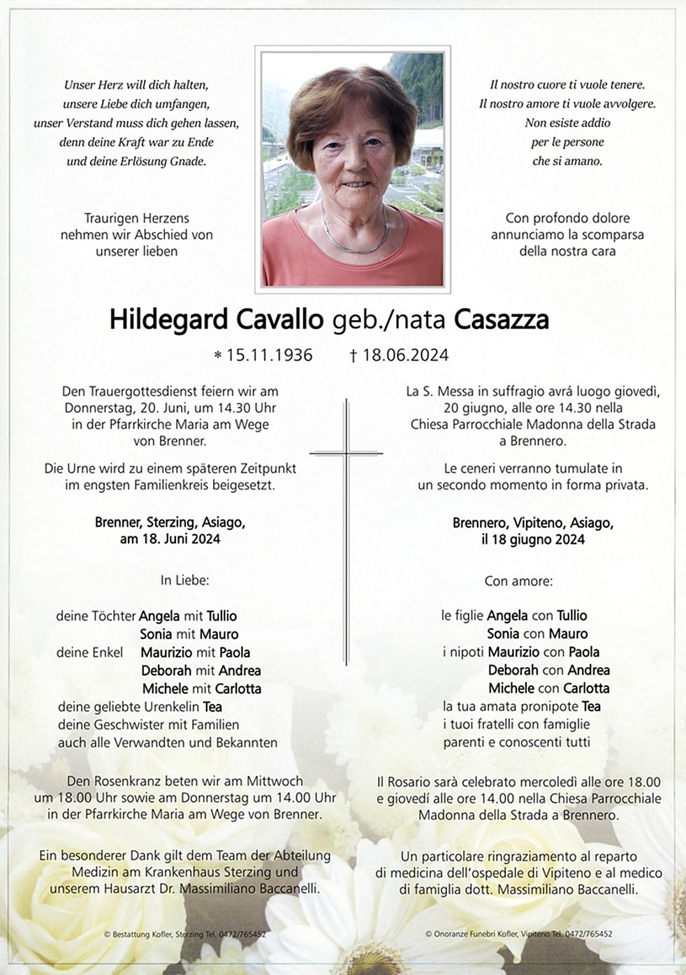 La S. Messa in suffragio avrá luogo giovedì, 20 giugno, alle ore 14.30 nella Chiesa Parrocchiale Madonna della Strada a Brennero. Le ceneri verranno tumulate in un secondo momento in forma privata.