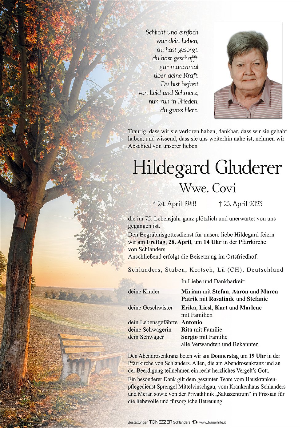 Liebe Hildegard,iaz hosch deine letzte Reise ountretn und dia führt di direkt ins Paradies 🌹Schiane Zeitn houbm mir mitnond vorbrocht und du worsch olm a supor Arbeitskollegin.I wear dia Zeitn nia vorgessen.Iaz bisch gongon ins Liacht wous kuane Leidn und Schmerzn gib und i hoff dass du ins von oubm our zuaschaugsch und beschützt.Leb wohl Hilde du wearsch olm a Platzl houbm in meinem Herzen 🌹❤