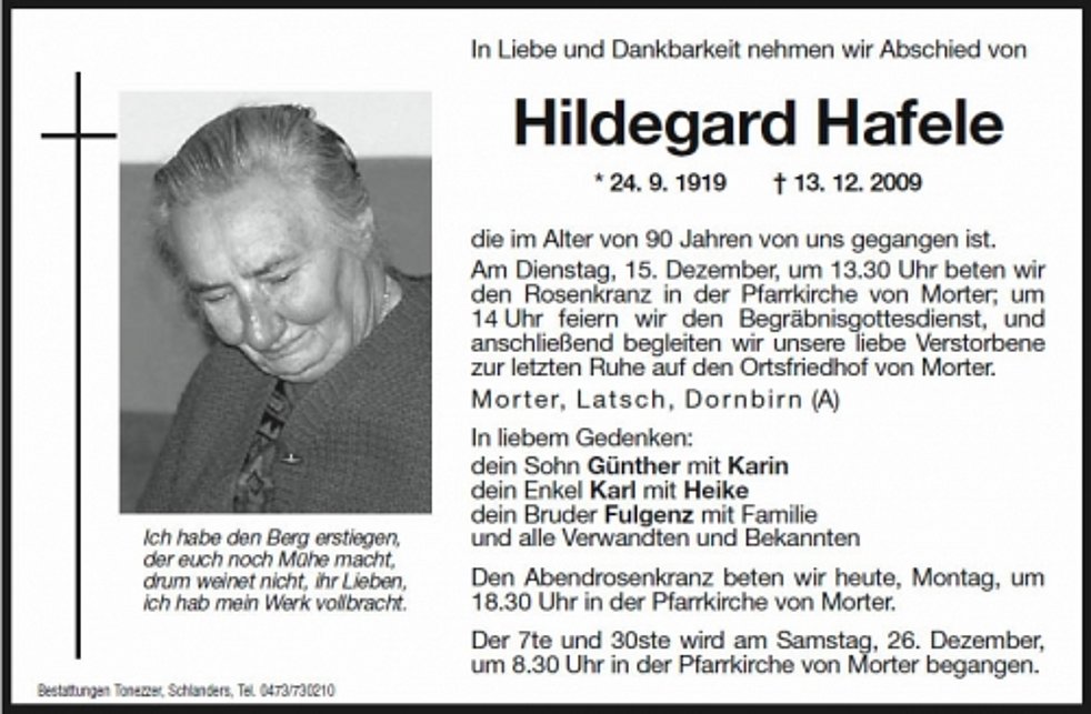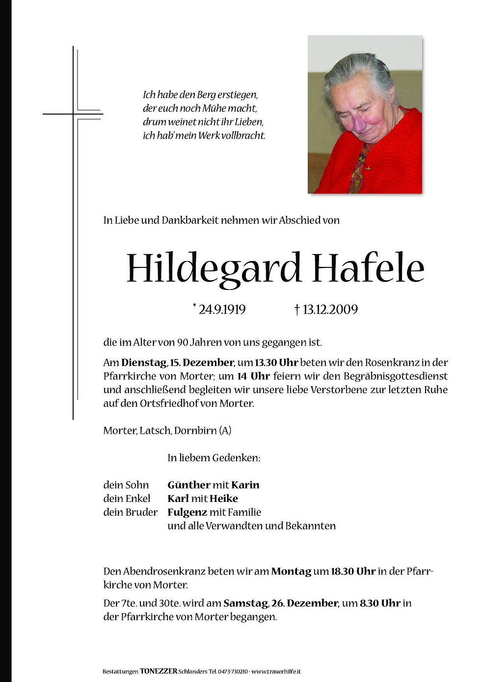 Am Dienstag, 15. Dezember, um 13.30 Uhr beten wir den Rosenkranz in der Pfarrkirche von Morter; um 14 Uhr feiern wir den Begräbnisgottesdienst und anschließend begleiten wir unsere liebe Verstorbene zur letzten Ruhe auf den Ortsfriedhof von Morter.