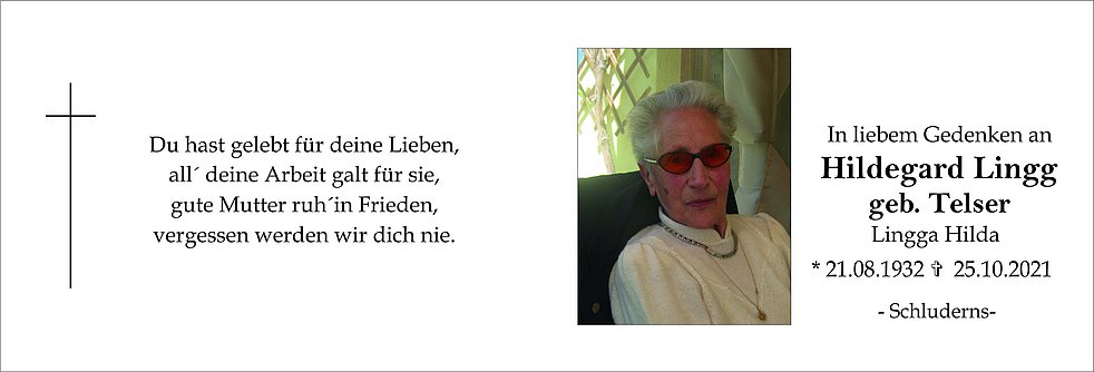 Den Trauergottesdienst feiern wir am Donnerstag, dem 28. Oktober um 14.00 Uhr in der Pfarrkirche von Schluderns.