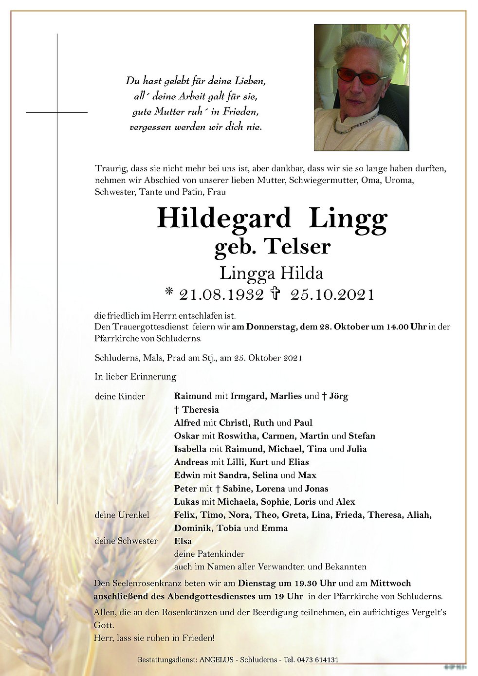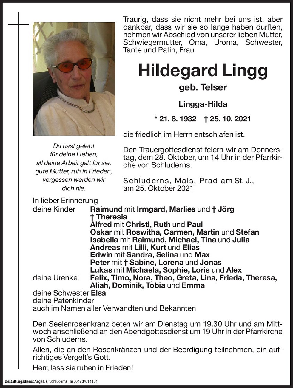 Bestattungsdienst: ANGELUS - Schluderns - Tel. 0473 614131