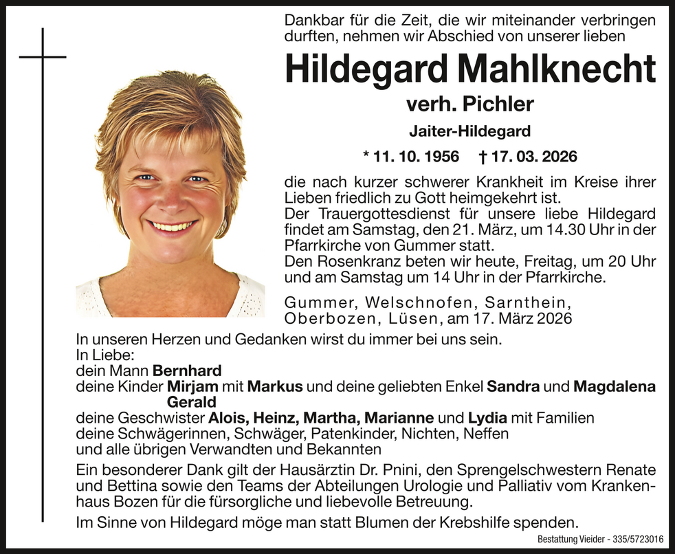 Im Sinne von Hildegard möge man statt Blumen der Krebshilfe spenden.
