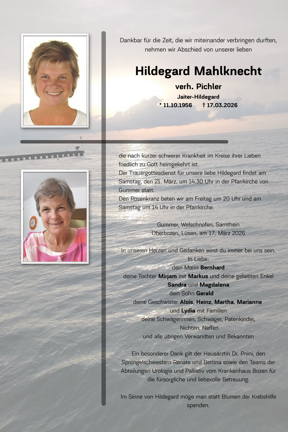 Ein besonderer Dank gilt der Hausärztin Dr. Pnini, den Sprengelschwestern Renate und Bettina sowie den Teams der Abteilungen Urologie und Palliativ vom Krankhaus Bozen für die fürsorgliche und liebevolle Betreuung.