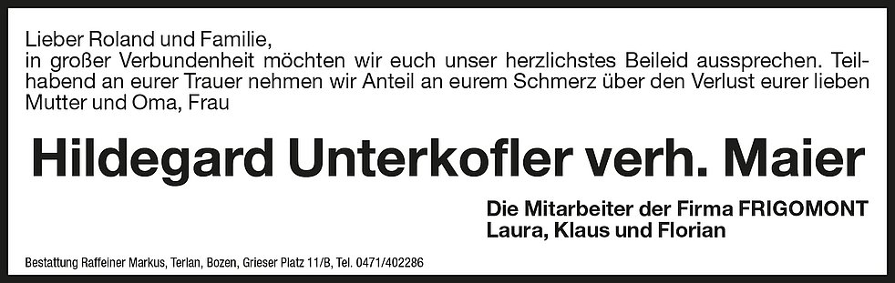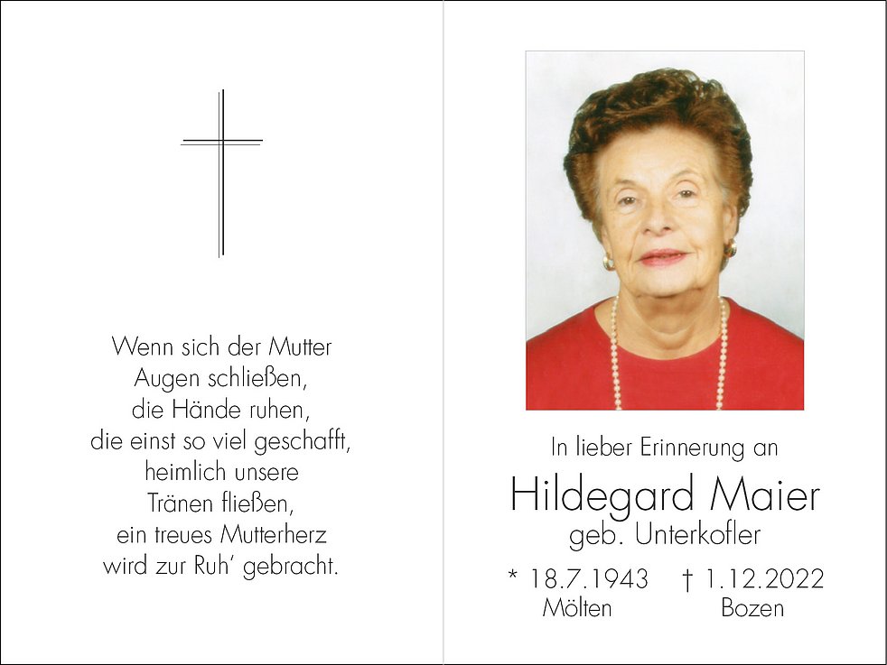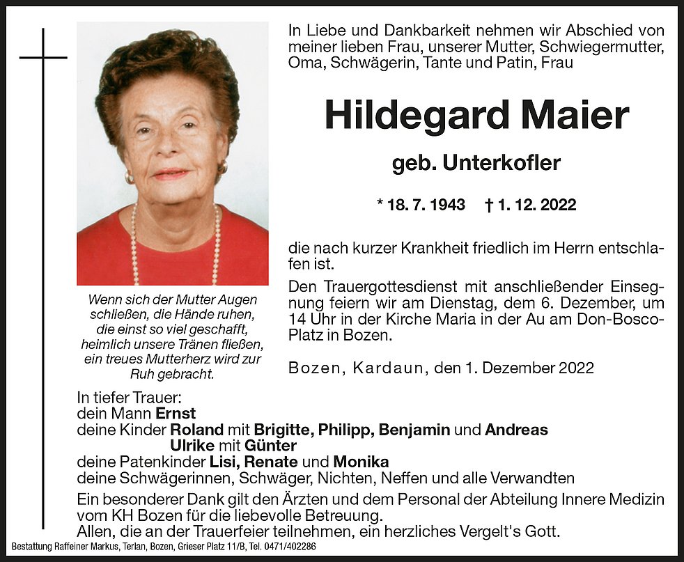 Den Trauergottesdienst mit anschließender Einsegnung feiern wir am Dienstag, dem 6. Dezember, um 14.00 Uhr in der Kirche Maria in der Au am Don-Bosco-Platz in Bozen.