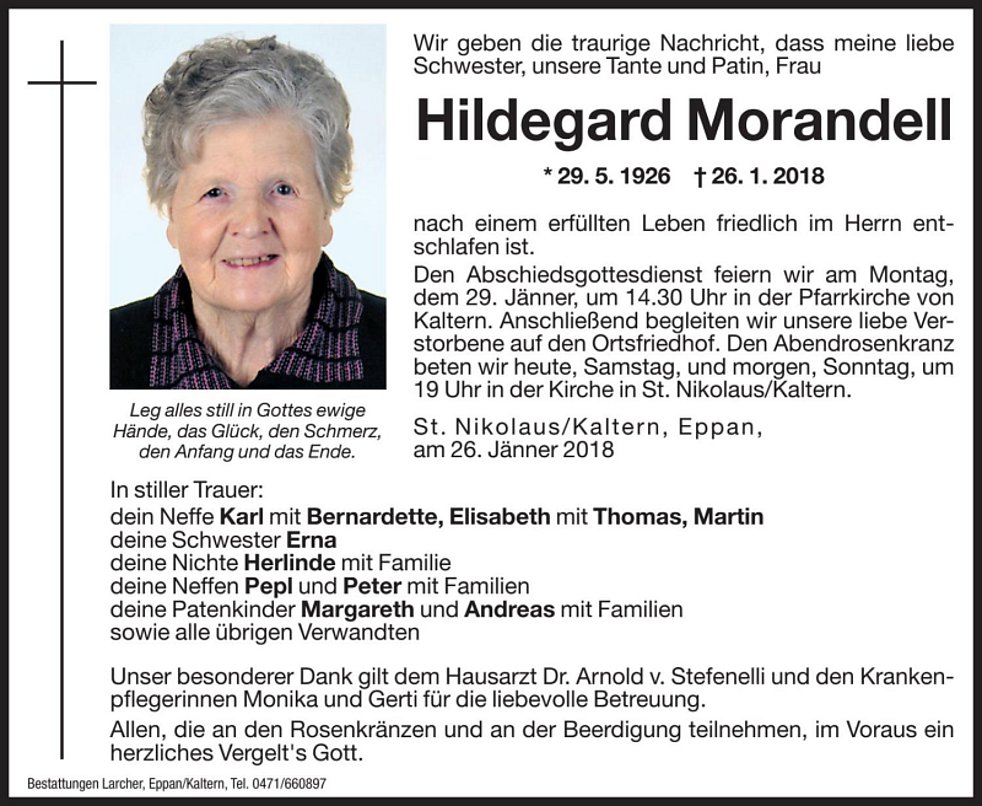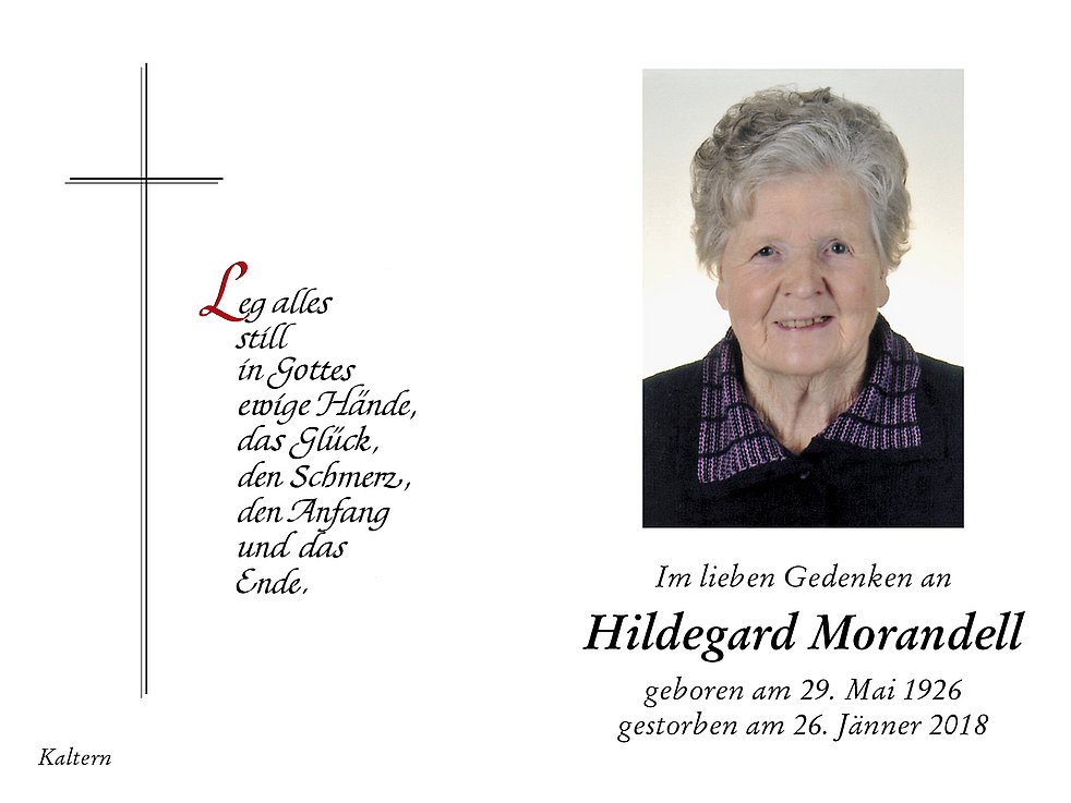 Den Abschiedsgottesdienst feiern wir am Montag, dem 29. Jänner um 14.30 Uhr in der Pfarrkirche von Kaltern. Anschließend begleiten wir unsere liebe Verstorbene auf den Ortsfriedhof.