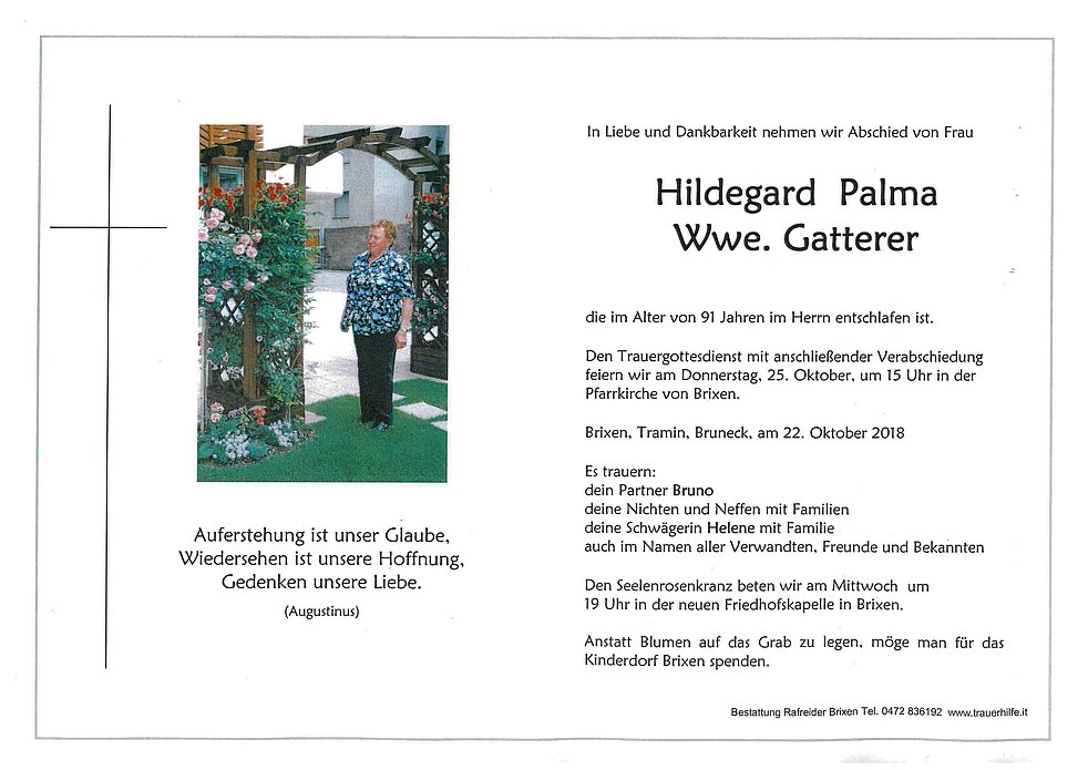 Gedankt sei den Ärzten und dem Pflegepersonal der Abteilung Orthopädie des Brixner Krankenhauses, der Kurzzeitpflege des Sanatorium, 1.Stock, und der Pflegerin Anna für die liebevolle Betreuung sowie allen, die am Rosenkranz und an der Verabschiedung teilnehmen.