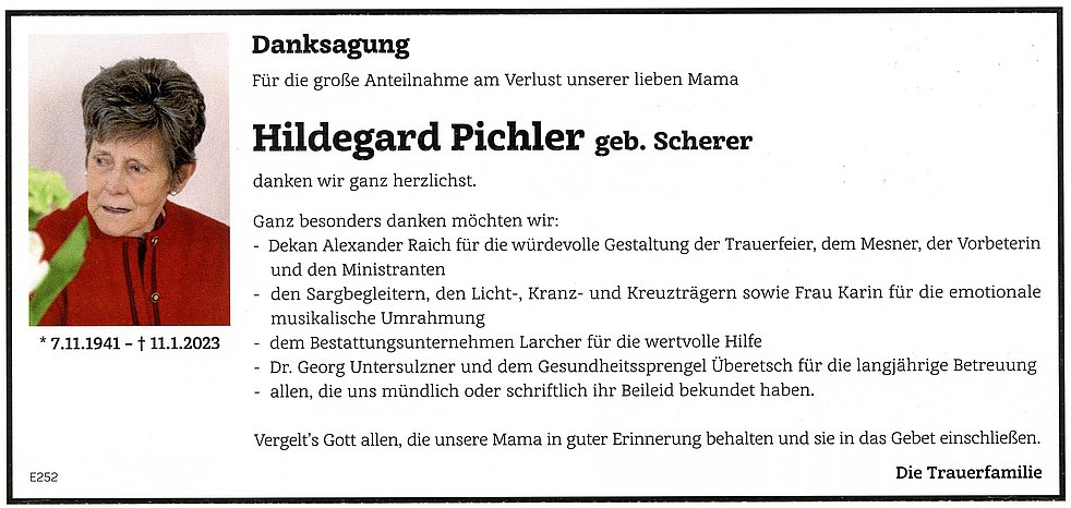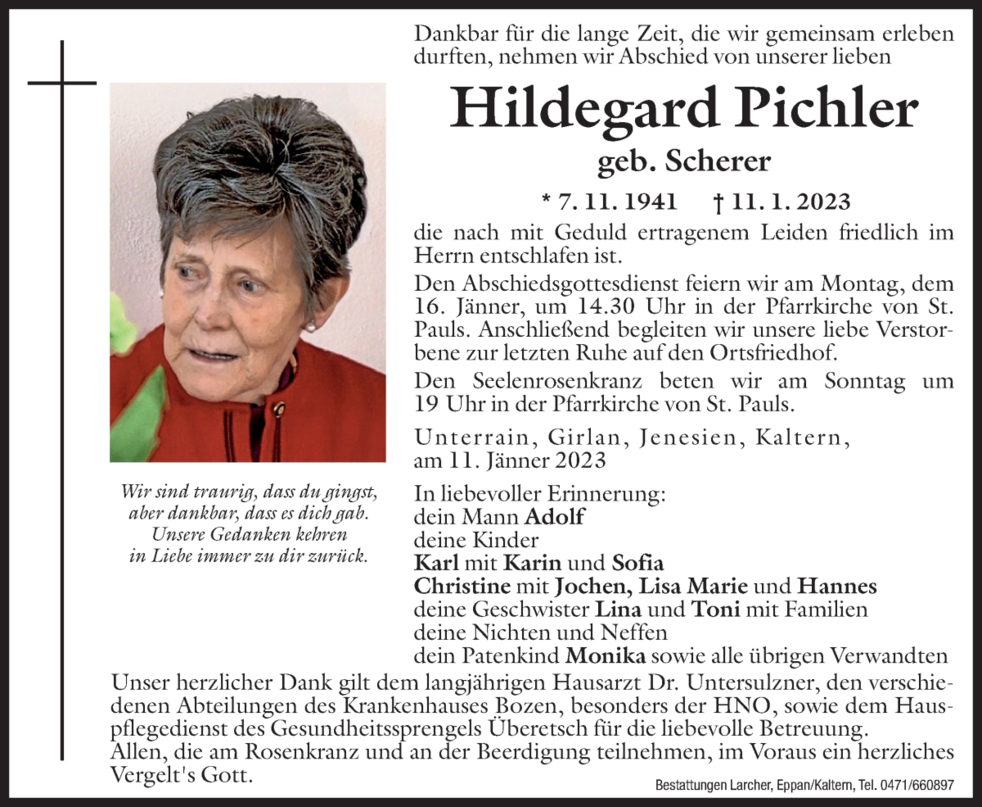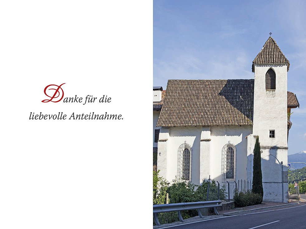 Unser herzlicher Dank gilt dem langjährigen Hausarzt Dr. Untersulzner, den verschiedenen Abteilungen des Krankenhauses Bozen, besonders der HNO, sowie dem Hauspflegedienst des Gesundheitssprengels Überetsch für die liebevolle Betreuung.