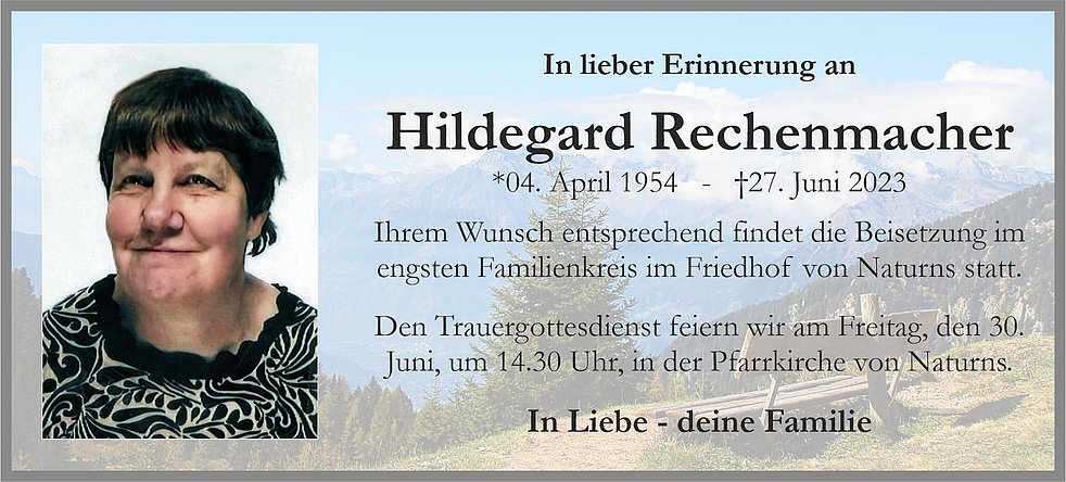 Genau a Woch dernoch, wia a Fluach iber olls war, muass des "Schiache" passiern. I woas, das es dir genauso fest weah tuat, wia miar. Ober jatz seids mitnond an a bessern Ort. Jatz konsch du des sechn, wos mir nu vor den Unglück gsechn hobn. Hob a schiene, friedliche Zeit mitnond, bis mer ins olle wieder sechn.