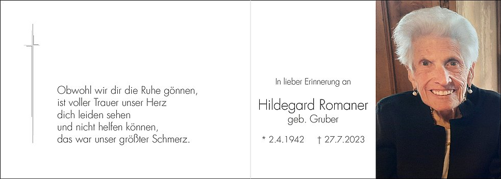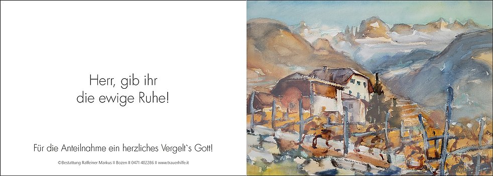 Den Trauergottesdienst feiern wir am Montag, dem 31. Juli, um 9.30 Uhr in der Pfarrkirche von Rentsch. Anschließend um 11 Uhr begleiten wir unsere liebe Mama zur letzten Ruhe auf den städtischen Friedhof von Bozen-Oberau, ausgehend von der Friedhofskapelle.