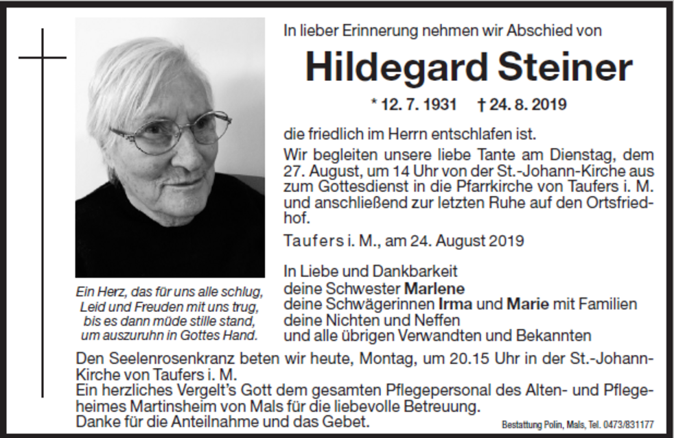 Taufers i. M. und anschließend zur letzten Ruhe auf den Ortsfriedhof.