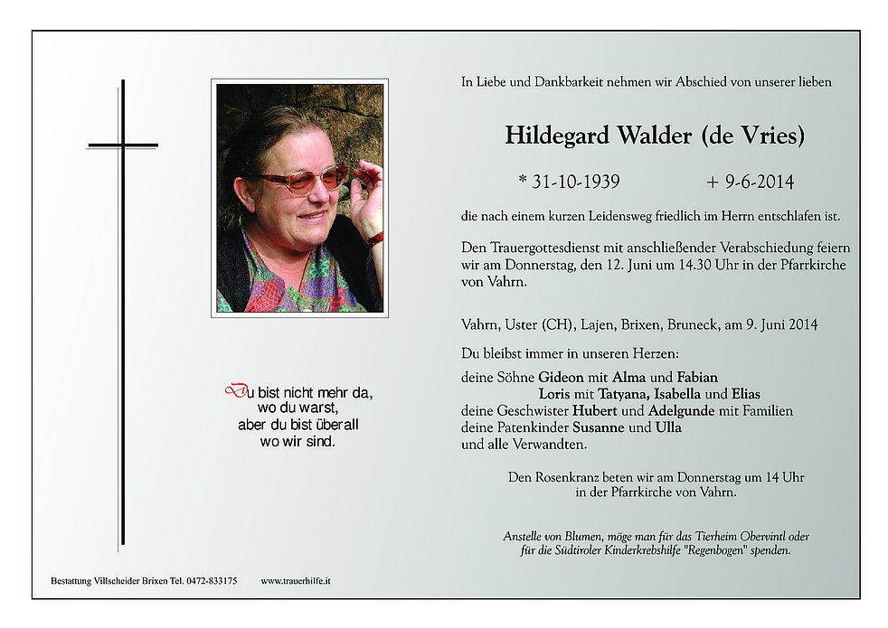 Den Trauergottesdienst mit anschließender Verabschiedung feiern wir am Donnerstag, den 12. Juni um 14.30 Uhr in der Pfarrkirche von Vahrn.