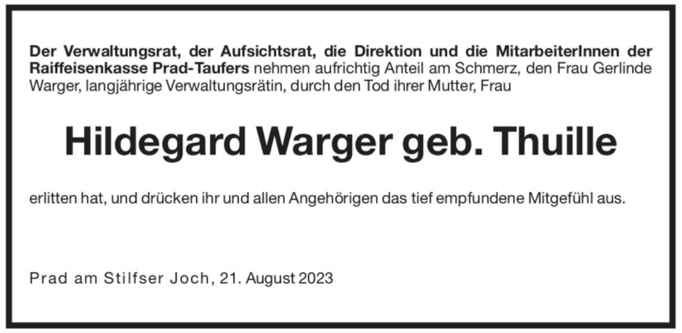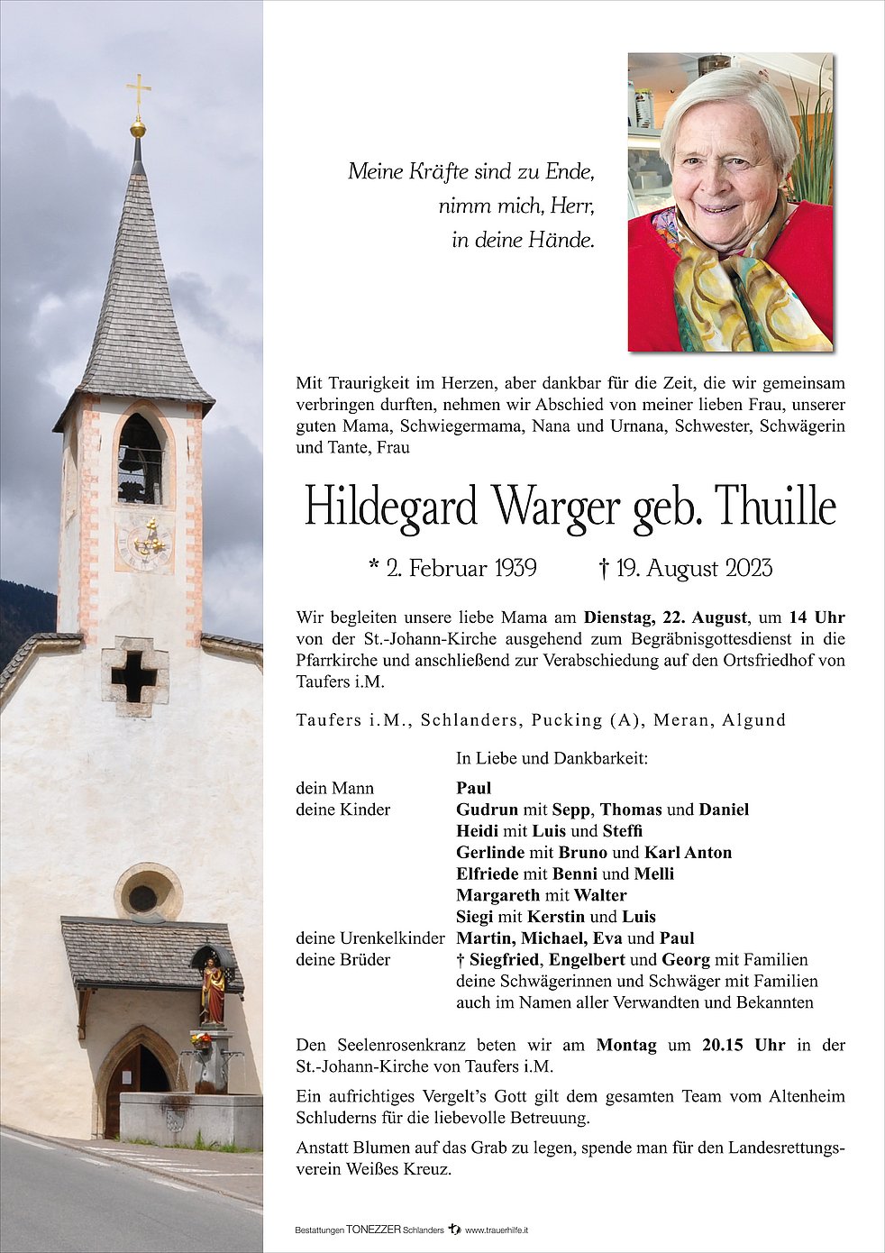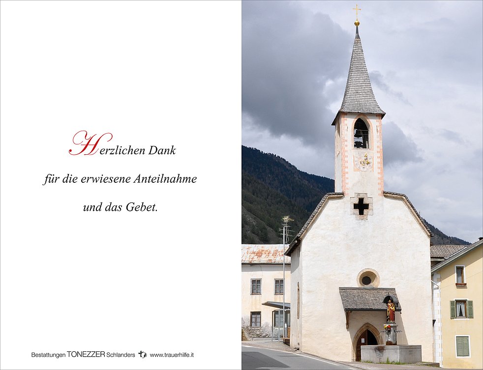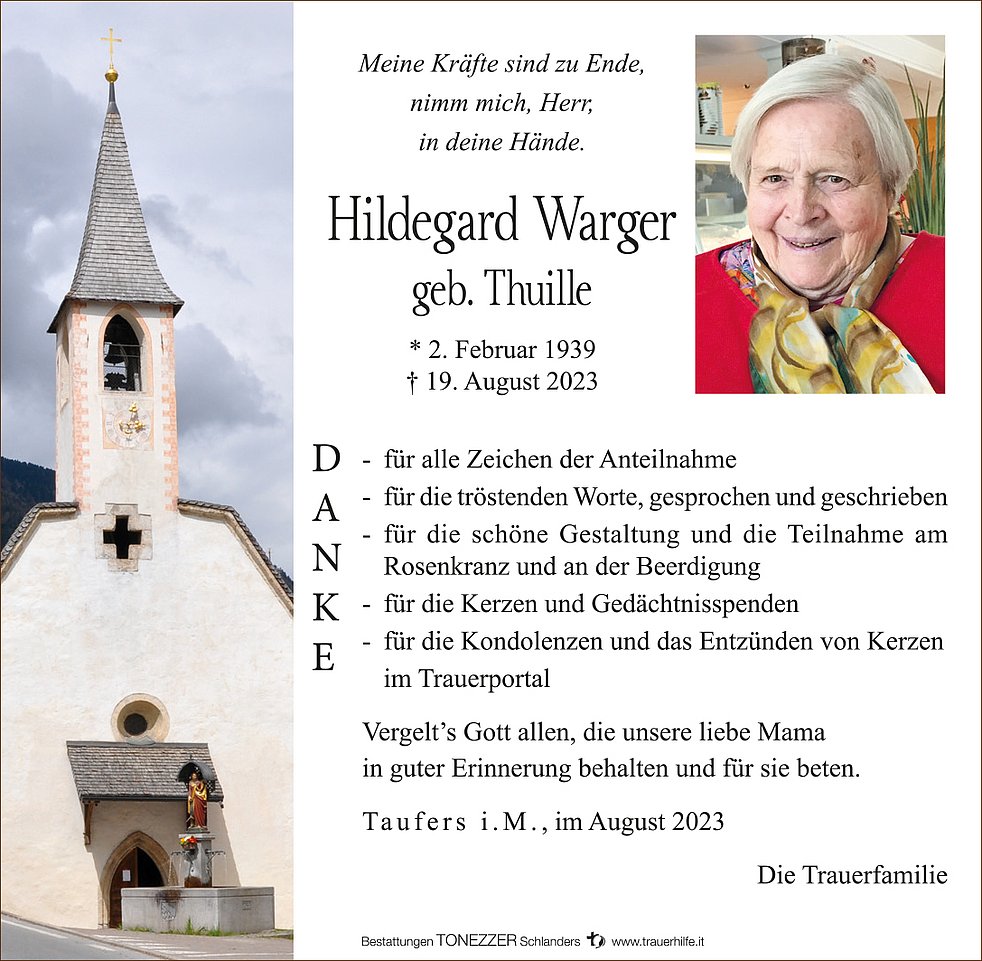 Wir begleiten unsere liebe Mama am Dienstag, 22. August, um 14 Uhr von der St.-Johann-Kirche ausgehend zum Begräbnisgottesdienst in die Pfarrkirche und anschließend zur Verabschiedung auf den Ortsfriedhof von Taufers i.M.