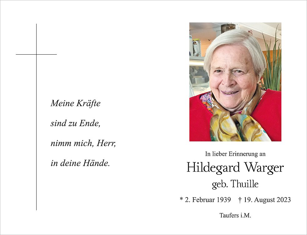 Mit Traurigkeit im Herzen, aber dankbar für die Zeit, die wir gemeinsam verbringen durften, nehmen wir Abschied von meiner lieben Frau, unserer guten Mama, Schwiegermama, Nana und Urnana, Schwester, Schwägerin und Tante, Frau
