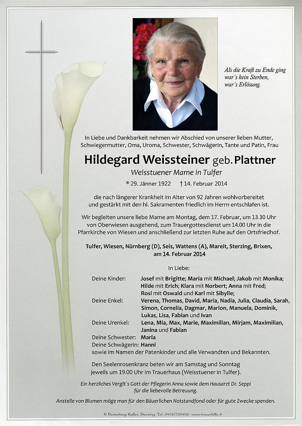 Anstelle von Blumen möge man für den Bäuerlichen Notstandfond oder für gute Zwecke spenden.