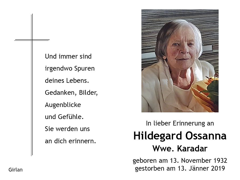 Den Abschiedsgottesdienst feiern wir am Mittwoch, dem 16. Jänner um 14.30 Uhr in der Pfarrkirche von Girlan. Anschließend begleiten wir unsere liebe Verstorbene auf den Ortsfriedhof.