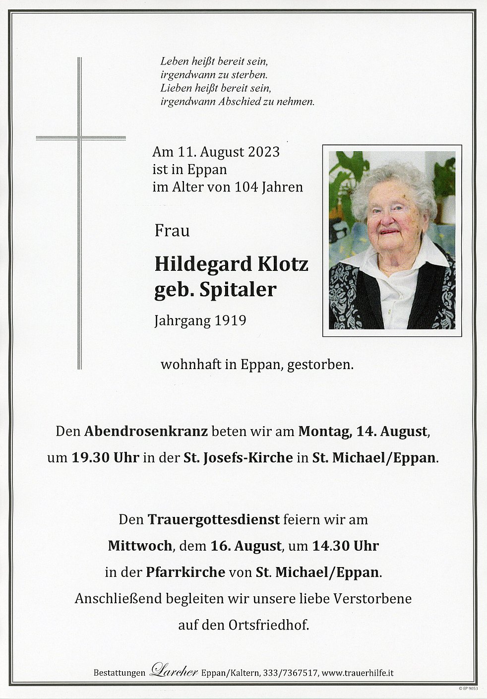Den Trauergottesdienst feiern wir am Mittwoch, dem 16. August, um 14.30 Uhr in der Pfarrkirche von St. Michael/Eppan. Anschließend begleiten wir unsere liebe Verstorbene auf den Ortsfriedhof.