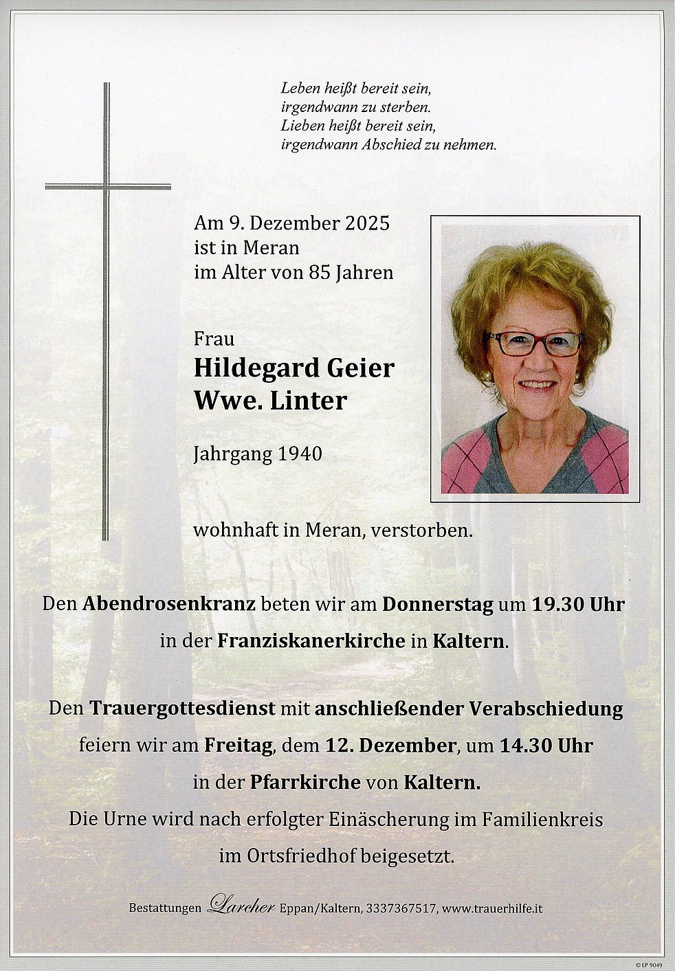 Den Trauergottesdienst mit anschließender Verabschiedung feiern wir am Freitag, dem 12. Dezember um 14.30 Uhr in der Pfarrkirche von Kaltern.