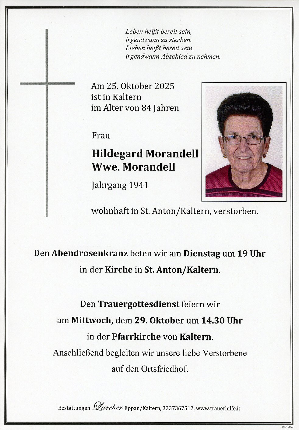 Den Trauergottesdienst feiern wir am Mittwoch, dem 29. Oktober um 14.30 Uhr in der Pfarrkirche von Kaltern. Anschließend begleiten wir unsere liebe Verstorbene auf den Ortsfriedhof