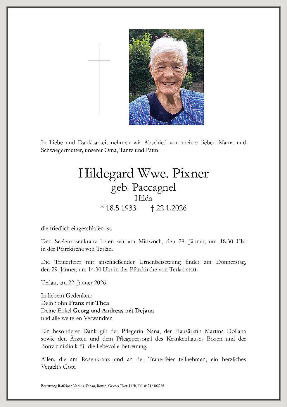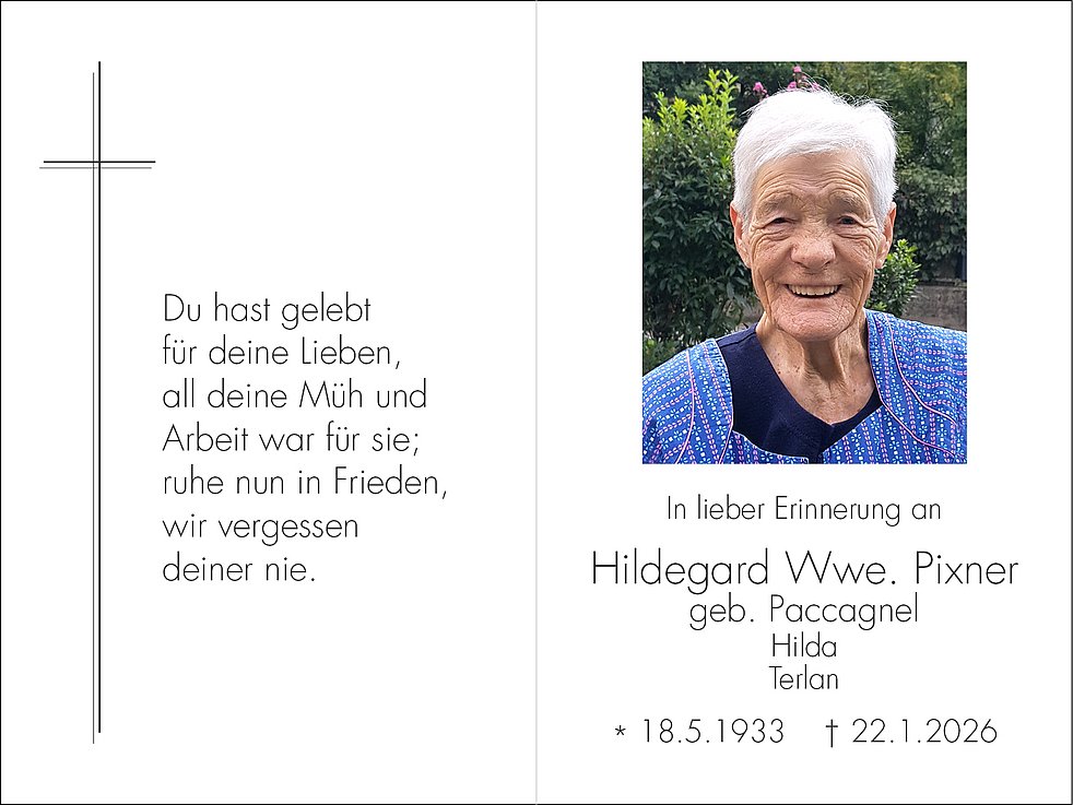 Die Trauerfeier mit anschließender Urnenbeisetzung findet am Donnerstag, den 29. Jänner, um 14.30 Uhr in der Pfarrkirche von Terlan statt.