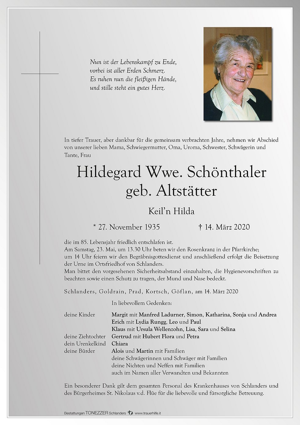 Am Samstag, 23. Mai, um 13.30 Uhr beten wir den Rosenkranz in der Pfarrkirche; um 14 Uhr feiern wir den Begräbnisgottesdienst und anschließend erfolgt die Beisetzung der Urne im Ortsfriedhof von Schlanders.