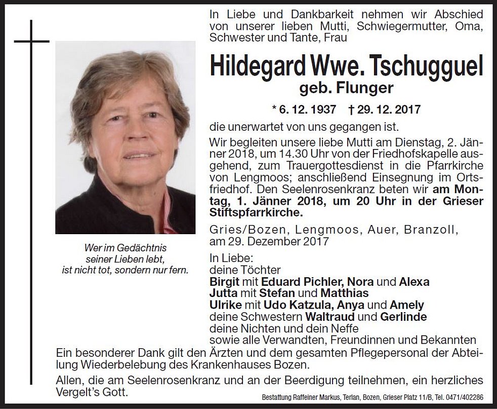 Wir begleiten unsere liebe Mutti am Dienstag, 2. Jänner 2018, um 14.30 Uhr von der Friedhofskapelle ausgehend, zum Trauergottesdienst in die Pfarrkirche von Lengmoos, anschließend Einsegnung im Ortsfriedhof.
