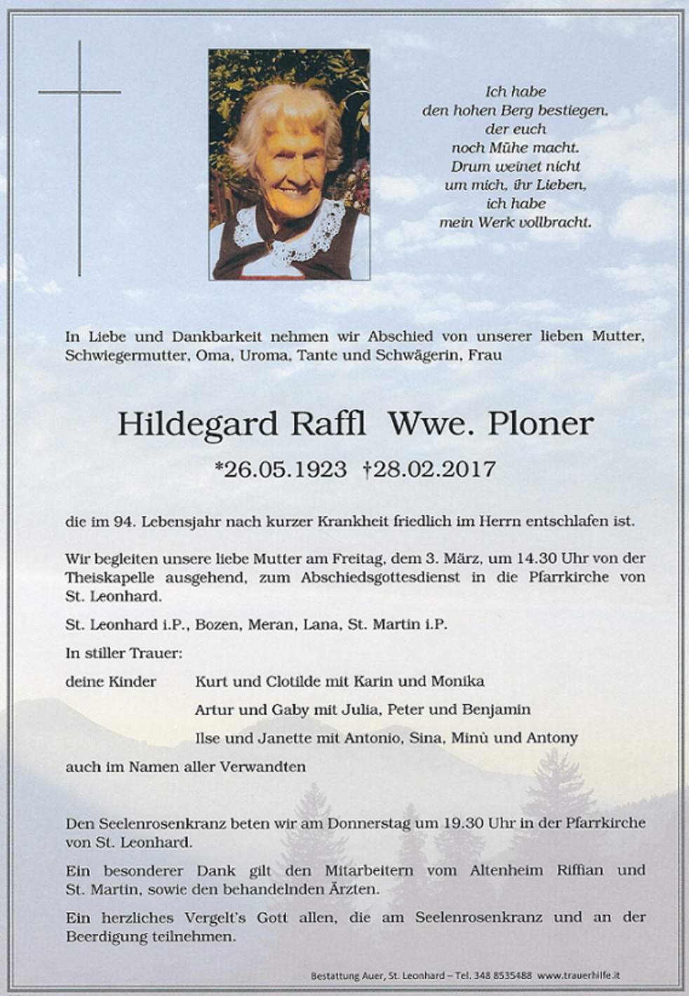 Wir begleiten unsere liebe Mutter am Freitag, dem 3. März, um 14.30 Uhr von der Theiskapelle ausgehend, zum Abschiedsgottesdienst in die Pfarrkirche von St. Leonhard.