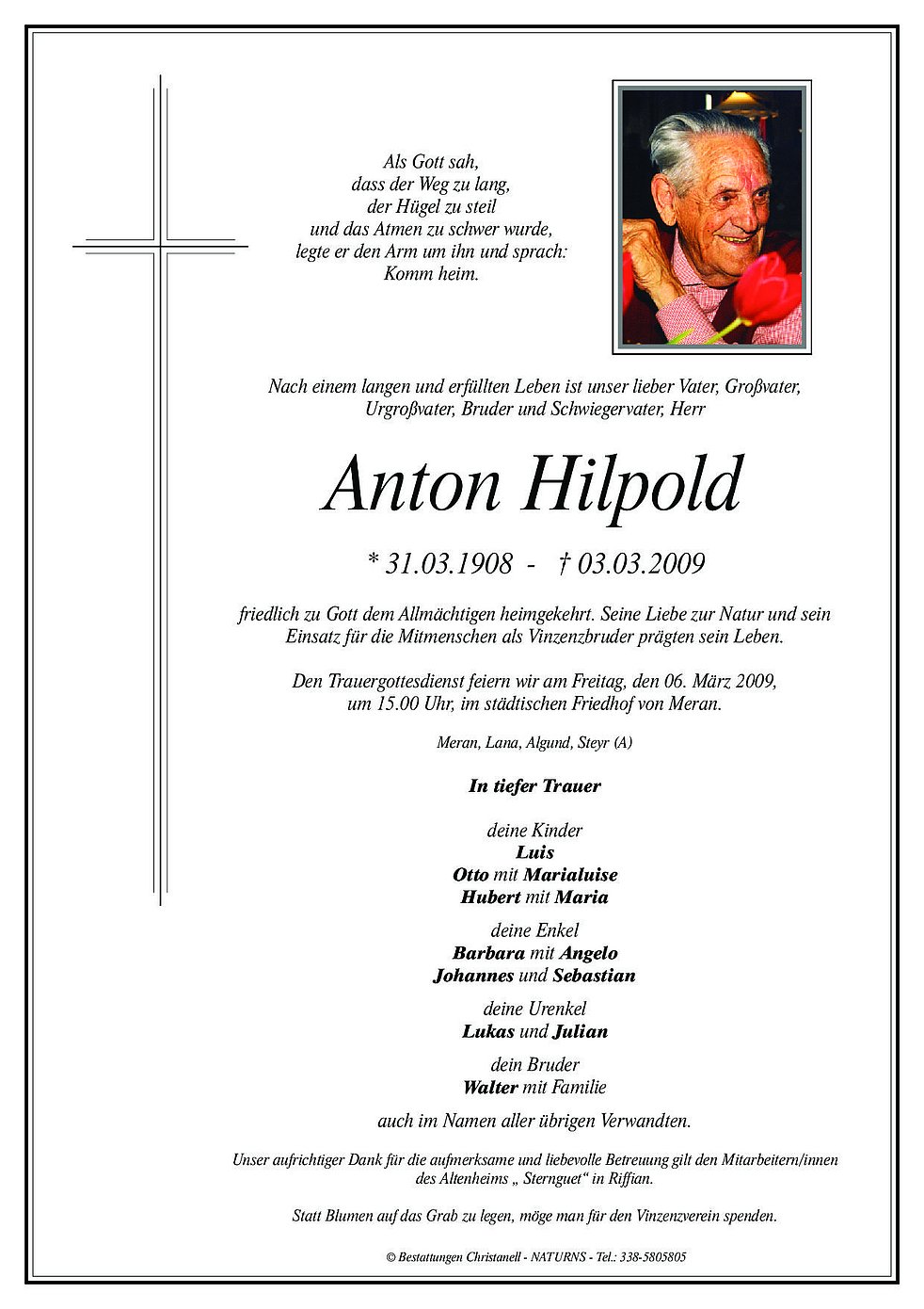 Den Trauergottesdienst feiern wir am Freitag, den 06. März 2009, um 15.00 Uhr, im städtischen Friedhof von Meran.