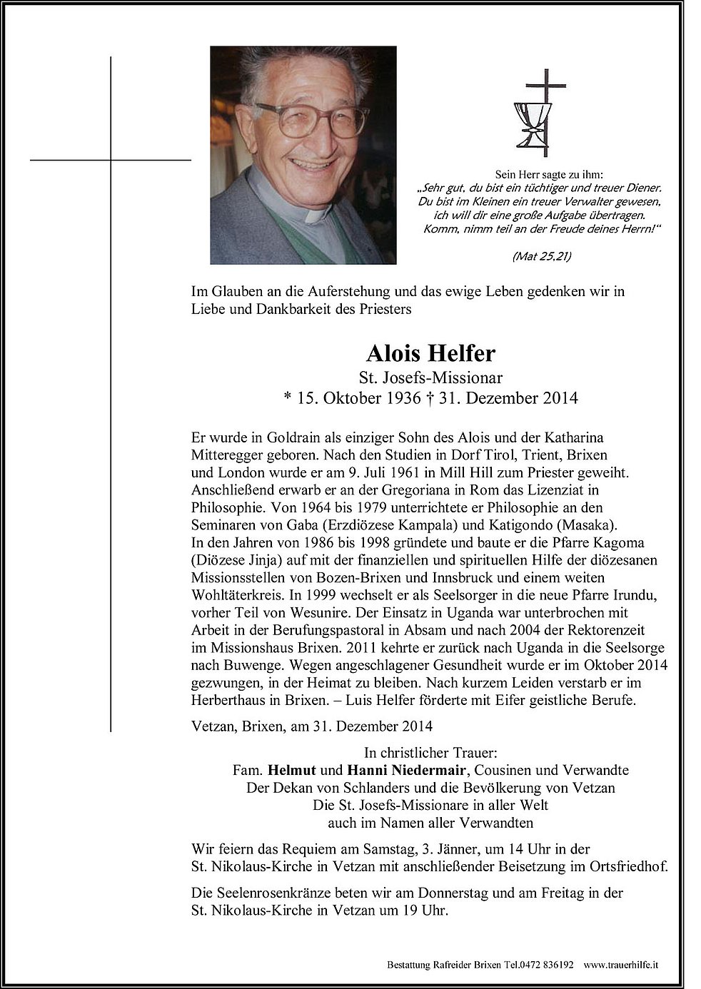Wir feiern das Requiem am Samstag, 3. Jänner, um 14 Uhr in der St. Nikolaus-Kirche in Vetzan mit anschließender Beisetzung im Ortsfriedhof.