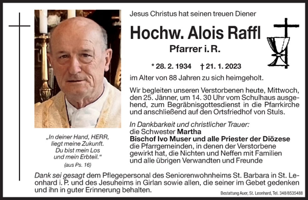 Hw. Pfarrer i. R. Alois Raffl, Goster Luis, 88 Jahre