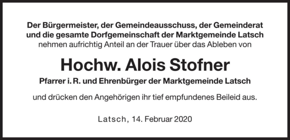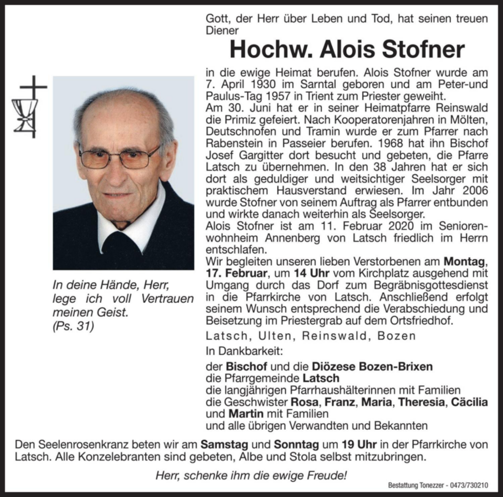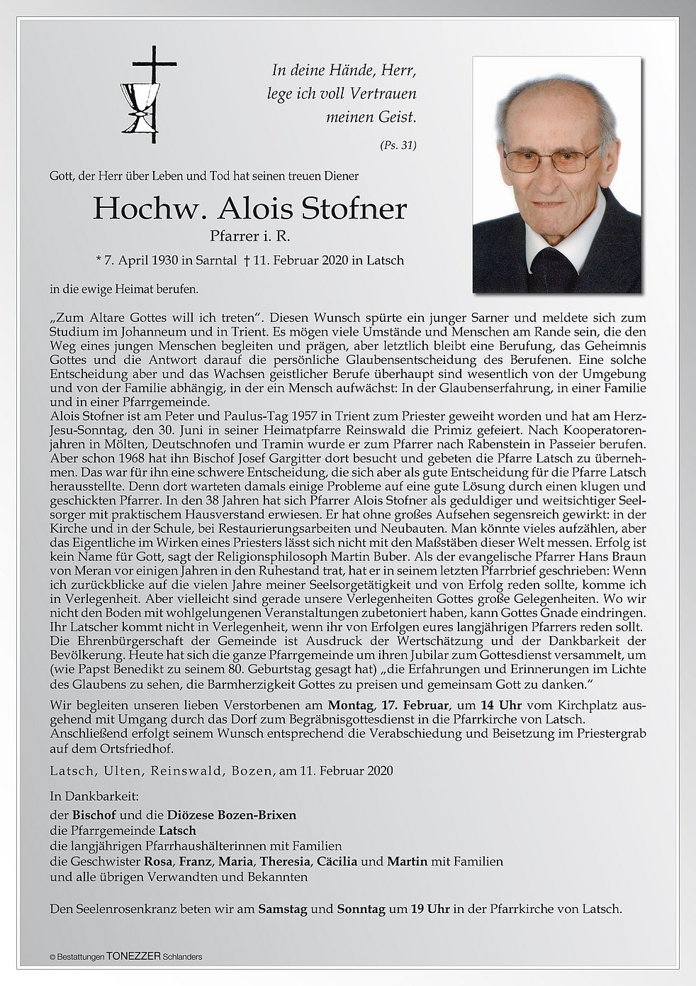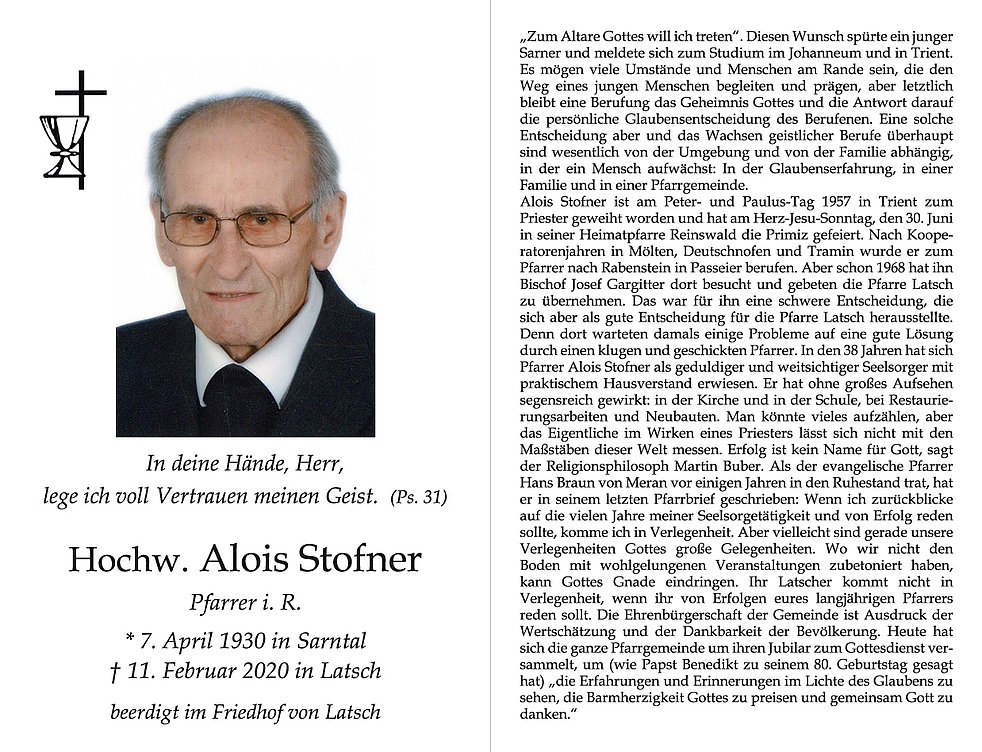 „Zum Altare Gottes will ich treten“. Diesen Wunsch spürte ein junger Sarner und meldete sich zum Studium im Johanneum und in Trient. Es mögen viele Umstände und Menschen am Rande sein, die den Weg eines jungen Menschen begleiten und prägen, aber letztlich bleibt eine Berufung, das Geheimnis Gottes und die Antwort darauf die persönliche Glaubensentscheidung des Berufenen. Eine solche Entscheidung aber und das Wachsen geistlicher Berufe überhaupt sind wesentlich von der Umgebung und von der Familie abhängig, in der ein Mensch aufwächst: In der Glaubenserfahrung, in einer Familie und in einer Pfarrgemeinde. Alois Stofner ist am Peter- und Paulus-Tag 1957 in Trient zum Priester geweiht worden und hat am Herz-Jesu-Sonntag, den 30. Juni in seiner Heimatpfarre Reinswald die Primiz gefeiert. Nach Kooperatorenjahren in Mölten, Deutschnofen und Tramin wurde er zum Pfarrer nach Rabenstein in Passeier berufen. Aber schon 1968 hat ihn Bischof Josef Gargitter dort besucht und gebeten die Pfarre Latsch zu übernehmen. Das war für ihn eine schwere Entscheidung, die sich aber als gute Entscheidung für die Pfarre Latsch herausstellte. Denn dort warteten damals einige Probleme auf eine gute Lösung durch einen klugen und geschickten Pfarrer. In den 38 Jahren hat sich Pfarrer Alois Stofner als geduldiger und weitsichtiger Seelsorger mit praktischem Hausverstand erwiesen. Er hat ohne großes Aufsehen segensreich gewirkt: in der Kirche und in der Schule, bei Restaurierungsarbeiten und Neubauten. Man könnte vieles aufzählen, aber das Eigentliche im Wirken eines Priesters lässt sich nicht mit den Maßstäben dieser Welt messen. Erfolg ist kein Name für Gott, sagt der Religionsphilosoph Martin Buber. Als der evangelische Pfarrer Hans Braun von Meran vor einigen Jahren in den Ruhestand trat, hat er in seinem letzten Pfarrbrief geschrieben: Wenn ich zurückblicke auf die vielen Jahre meiner Seelsorgetätigkeit und von Erfolg reden sollte, komme ich in Verlegenheit. Aber vielleicht sind gerade unsere Verlegenheiten Gottes große Gelegenheiten. Wo wir nicht den Boden mit wohlgelungenen Veranstaltungen zubetoniert haben, kann Gottes Gnade eindringen. Ihr Latscher kommt nicht in Verlegenheit, wenn ihr von Erfolgen eures langjährigen Pfarrers reden sollt. Die Ehrenbürgerschaft der Gemeinde ist Ausdruck der Wertschätzung und der Dankbarkeit der Bevölkerung. Heute hat sich die ganze Pfarrgemeinde um ihren Jubilar zum Gottesdienst versammelt, um (wie Papst Benedikt zu seinem 80. Geburtstag gesagt hat) „die Erfahrungen und Erinnerungen im Lichte des Glaubens zu sehen, die Barmherzigkeit Gottes zu preisen und gemeinsam Gott zu danken.“