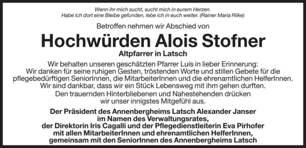 Wir begleiten unseren lieben Verstorbenen am Montag, 17. Februar, um 14 Uhr vom Kirchplatz ausgehend mit Umgang durch das Dorf zum Begräbnisgottesdienst in die Pfarrkirche von Latsch.