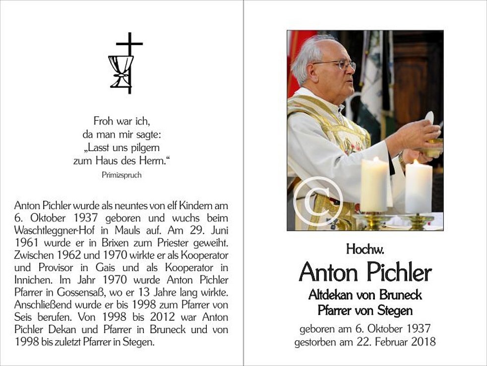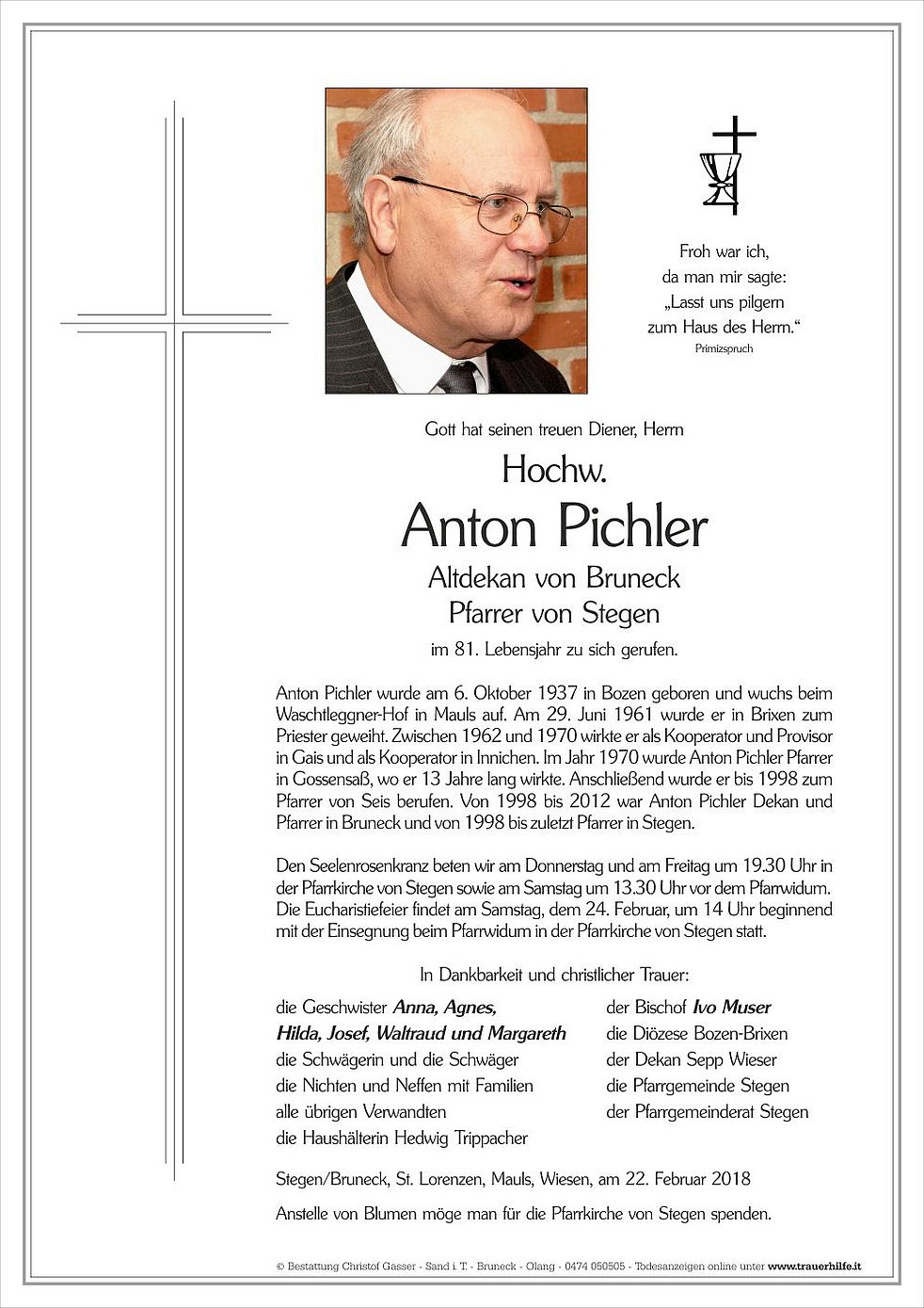 Anton Pichler wurde am 6. Oktober 1937 in Bozen geboren und wuchs beim Waschtleggner-Hof in Mauls auf. Am 29. Juni 1961 wurde er in Brixen zum Priester geweiht. Zwischen 1962 und 1970 wirkte er als Kooperator und Provisor in Gais und als Kooperator in Innichen. Im Jahr 1970 wurde Anton Pichler Pfarrer in Gossensaß, wo er 13 Jahre lang wirkte. Anschließend wurde er bis 1998 zum Pfarrer von Seis berufen. Von 1998 bis 2012 war Anton Pichler Dekan und Pfarrer in Bruneck und von 1998 bis zuletzt Pfarrer in Stegen.