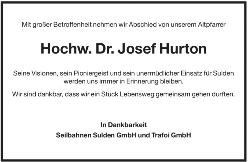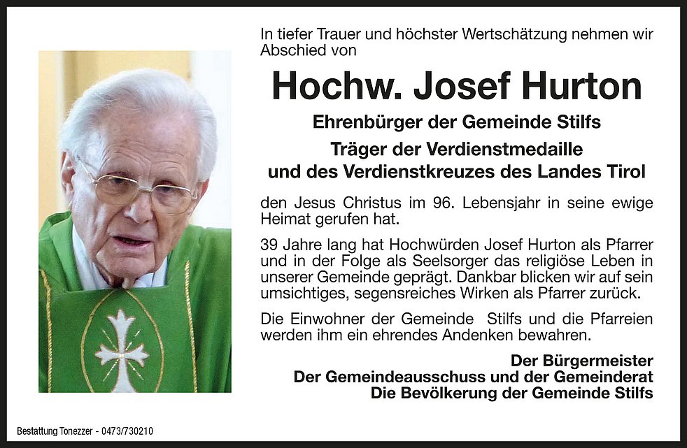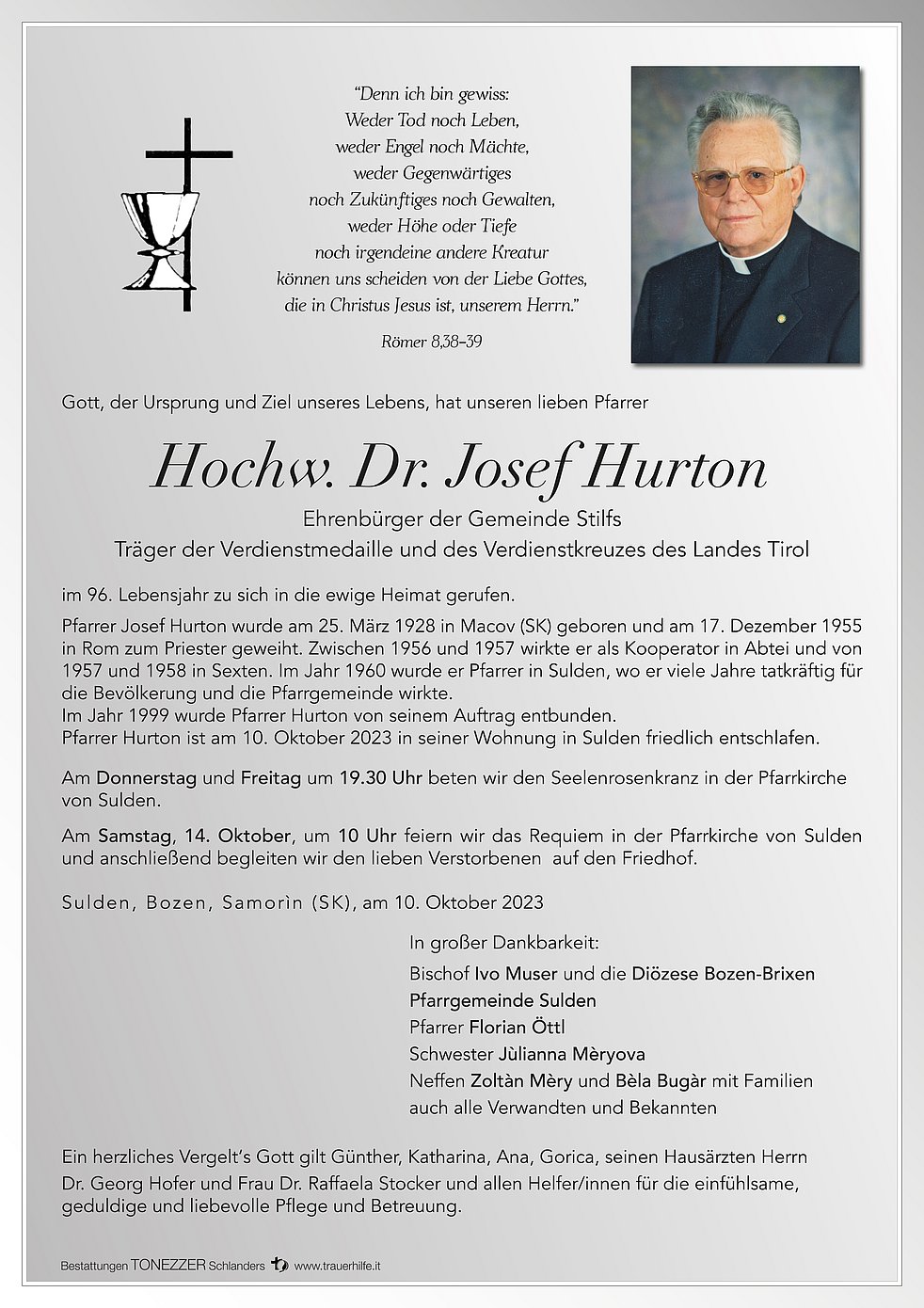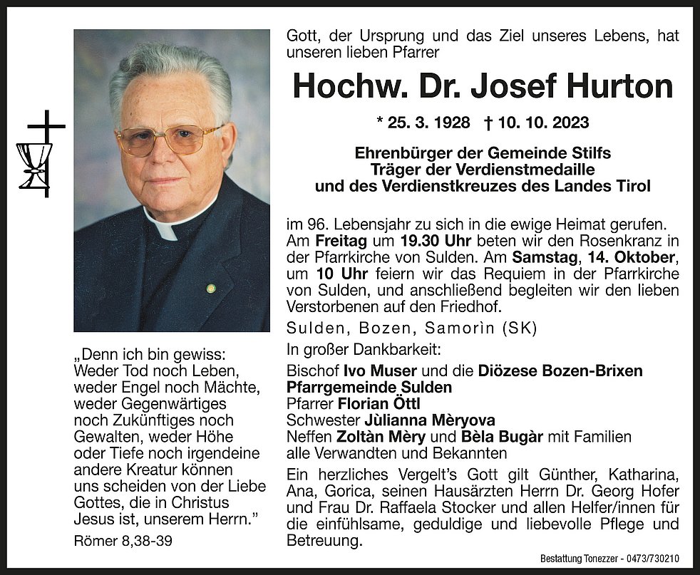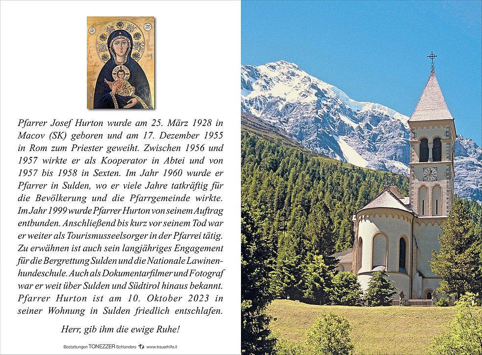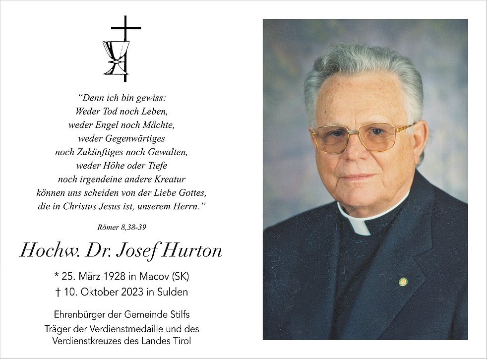 Pfarrer Hurton ist am 10. Oktober 2023 in seiner Wohnung in Sulden friedlich entschlafen.