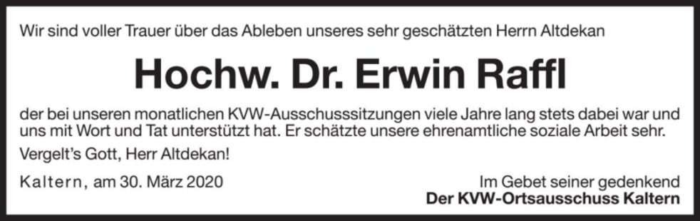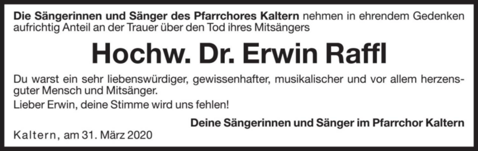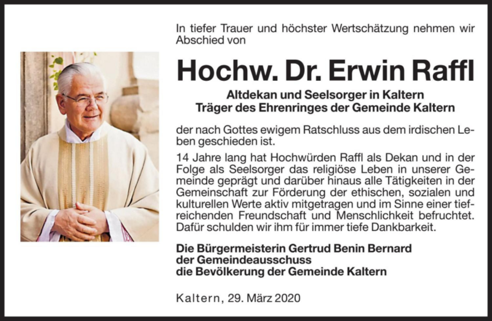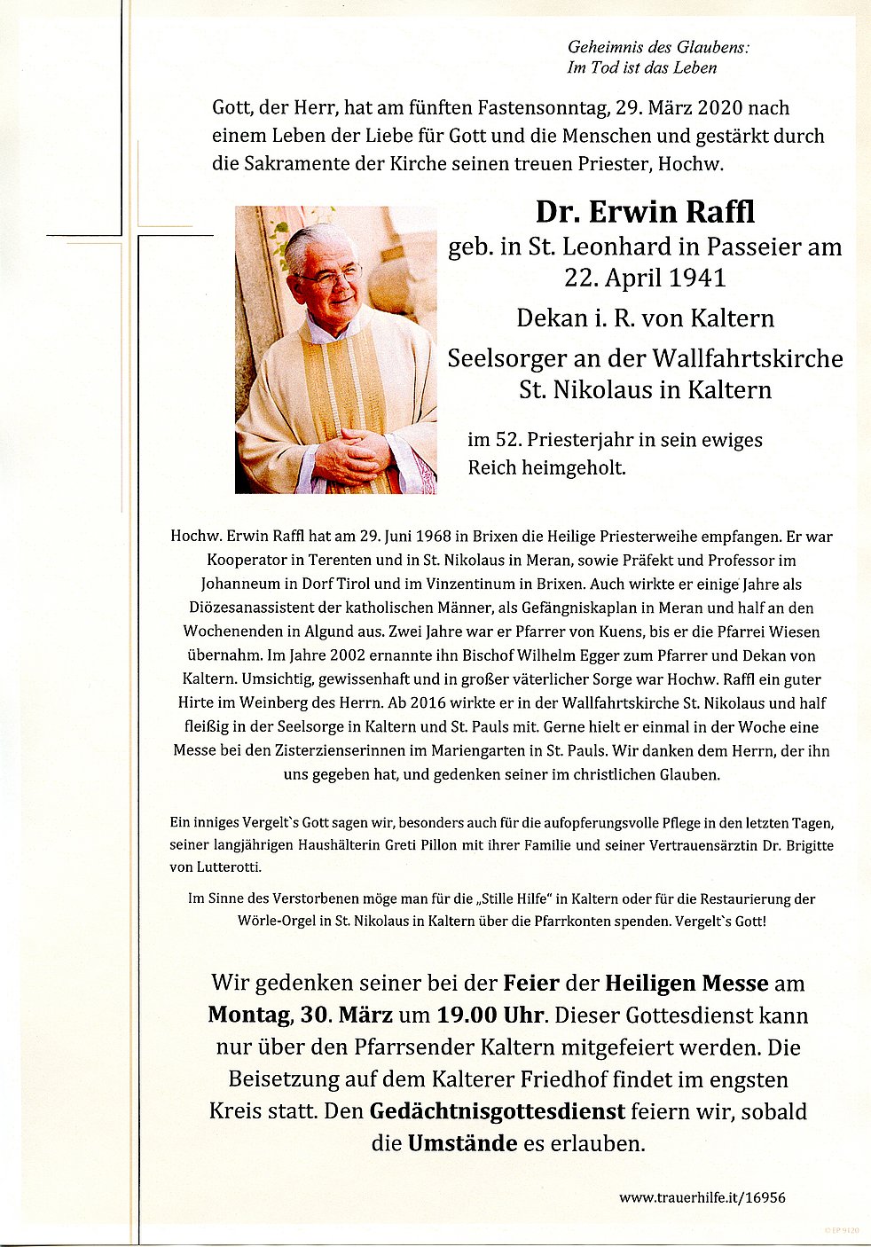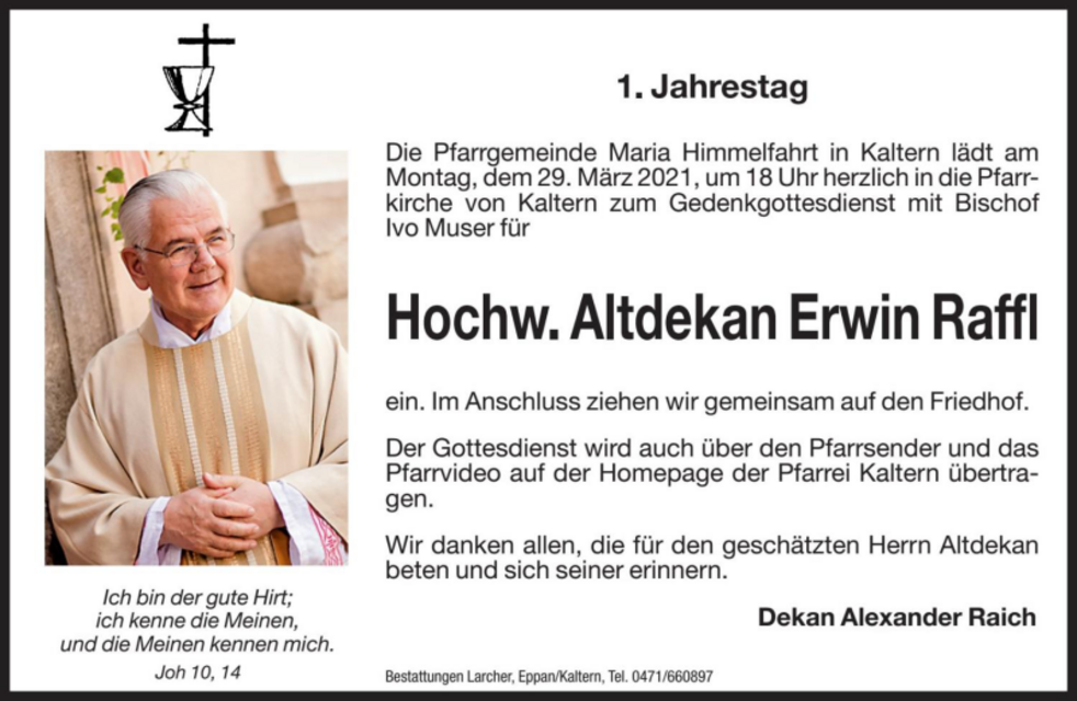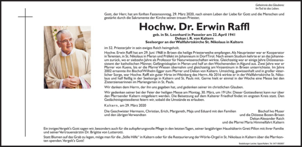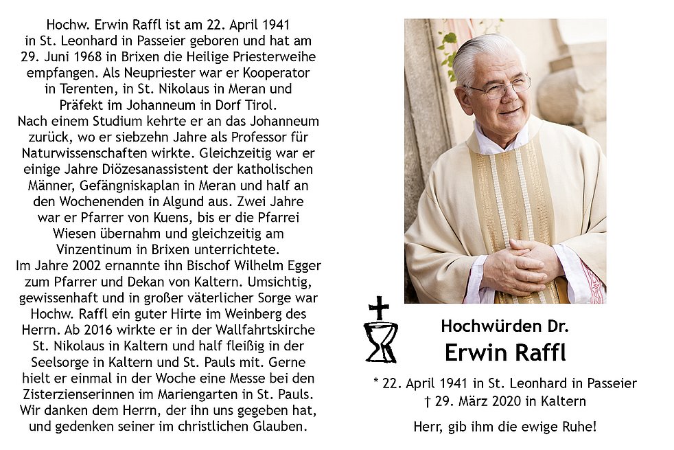 Hochw. Erwin Raffl hat am 29. Juni 1968 in Brixen die Heilige Priesterweihe empfangen. Als Neupriester war er Kooperator in Terenten, in St. Nikolaus in Meran und Präfekt im Johanneum in Dorf Tirol. Nach einem Studium kehrte er an das Johanneum zurück, wo er siebzehn Jahre als Professor für Naturwissenschaften wirkte. Gleichzeitig war er einige Jahre Diözesanassistent der katholischen Männer, Gefängniskaplan in Meran und half an den Wochenenden in Algund aus. Zwei Jahre war er Pfarrer von Kuens, bis er die Pfarrei Wiesen übernahm und gleichzeitig am Vinzentinum in Brixen unterrichtete. Im Jahre 2002 ernannte ihn Bischof Wilhelm Egger zum Pfarrer und Dekan von Kaltern. Umsichtig, gewissenhaft und in großer väterlicher Sorge war Hochw. Raffl ein guter Hirte im Weinberg des Herrn. Ab 2016 wirkte er in der Wallfahrtskirche St. Nikolaus und half fleißig in der Seelsorge in Kaltern und St. Pauls mit.GernehieltereinmalinderWocheeineMessebeidenZisterzienserinnenimMariengarteninSt.Pauls.