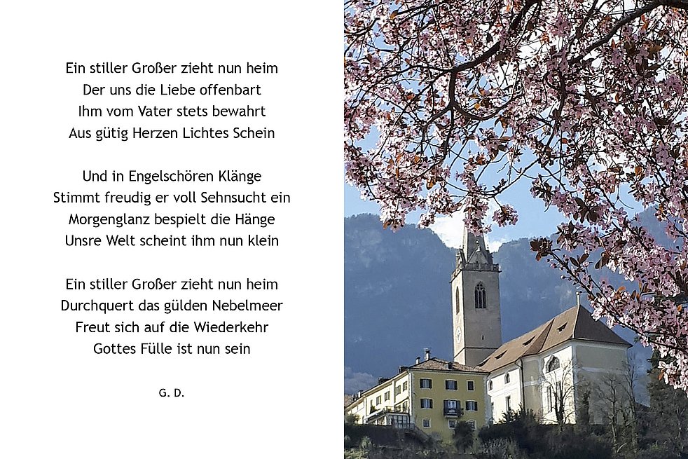 Wir gedenken seiner bei der Feier der Heiligen Messe am Montag, 30. März um 19.00 Uhr. Dieser Gottesdienst kann nur über den Pfarrsender Kaltern mitgefeiert werden. Die Beisetzung auf dem Kalterer Friedhof findet im engsten Kreis statt. Den Gedächtnisgottesdienst feiern wir, sobald die Umstände es erlauben.