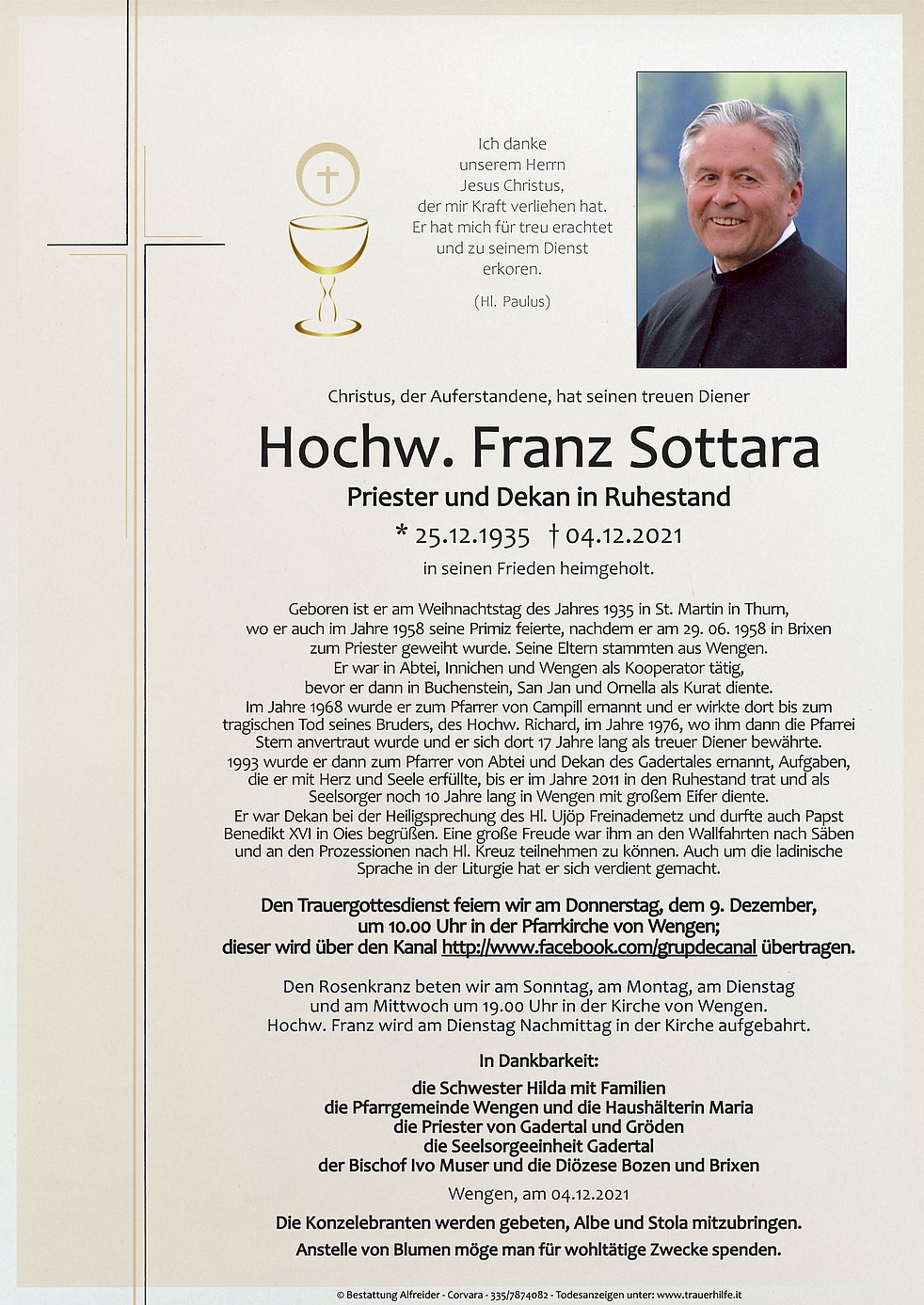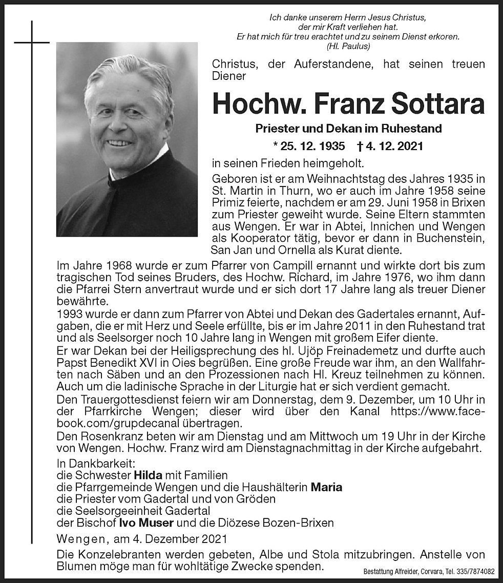 Den Rosenkranz beten wir am Dienstag und am Mittwoch um 19.00 Uhr in der Kirche von Wengen. Hochw. Franz wird am Dienstag Nachmittag in der Kirche aufgebahrt.