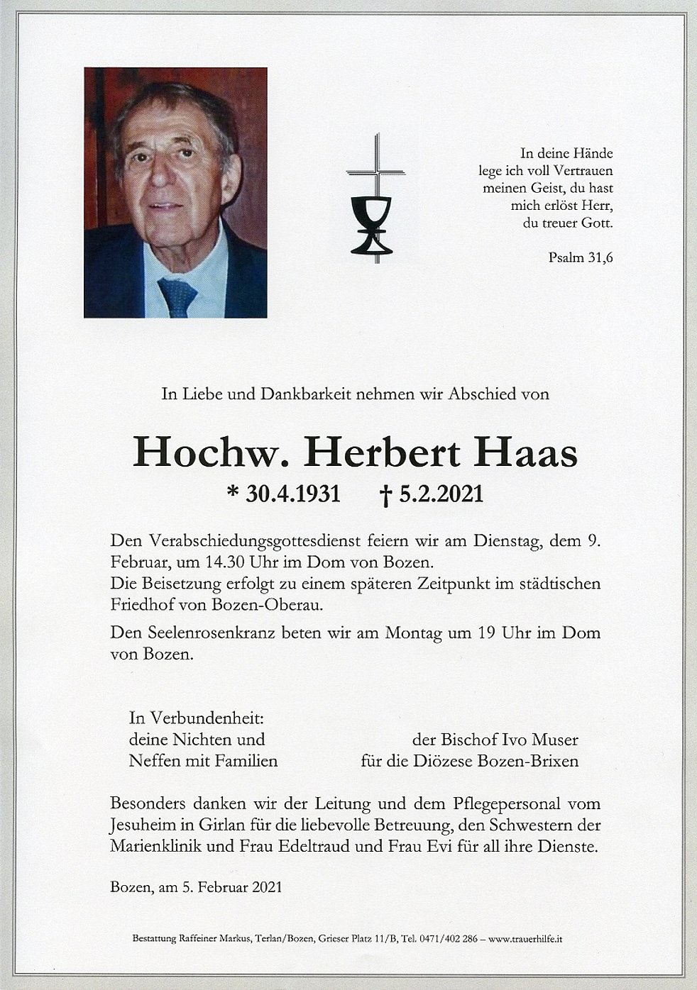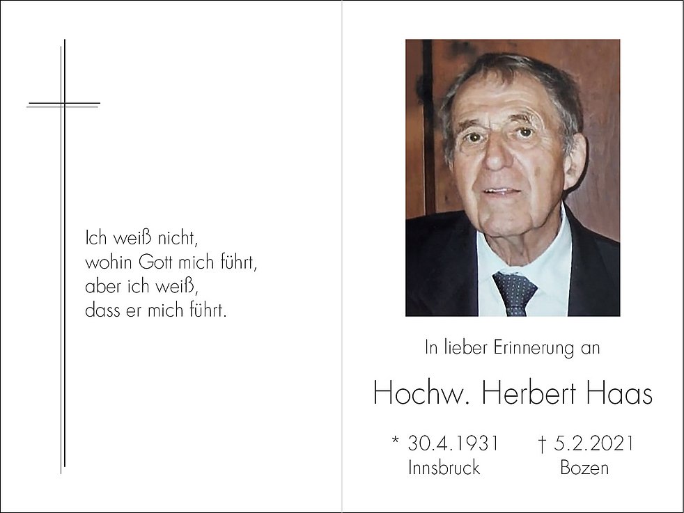 Die Beisetzung erfolgt zu einem späteren Zeitpunkt im städtischen Friedhof von Bozen-Oberau.