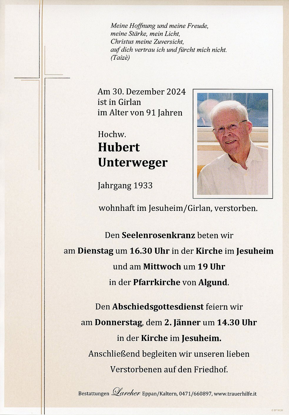 Den Abschiedsgottesdienst feiern wir am Donnerstag, dem 2. Jänner um 14.30 Uhr in der Kirche im Jesuheim in Girlan. Anschließend begleiten wir unseren lieben Verstorbenen auf den Friedhof.
