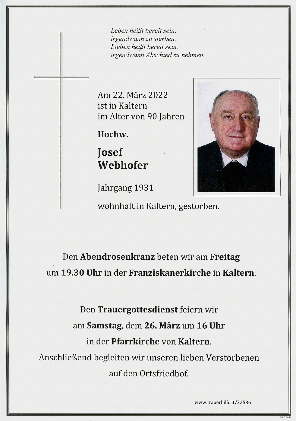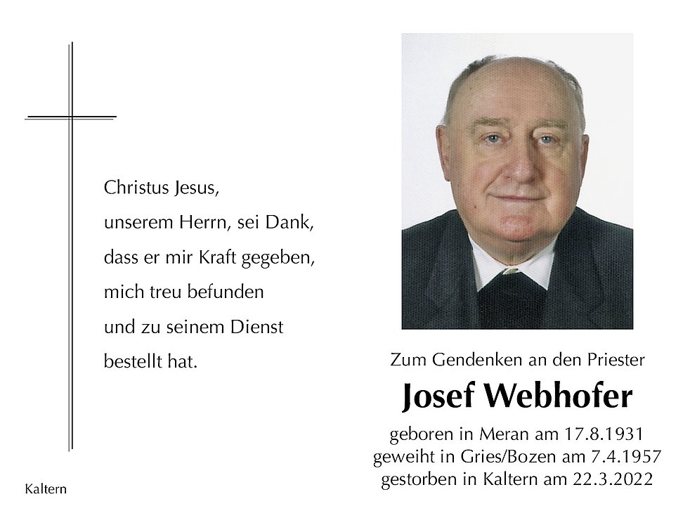 Wir feiern den Abschiedsgottesdienst am Samstag, dem 26. März um 16 Uhr in der Pfarrkirche von Kaltern und bestatten anschließend den Verstorbenen in der Priestergruft im Friedhof von Kaltern.
