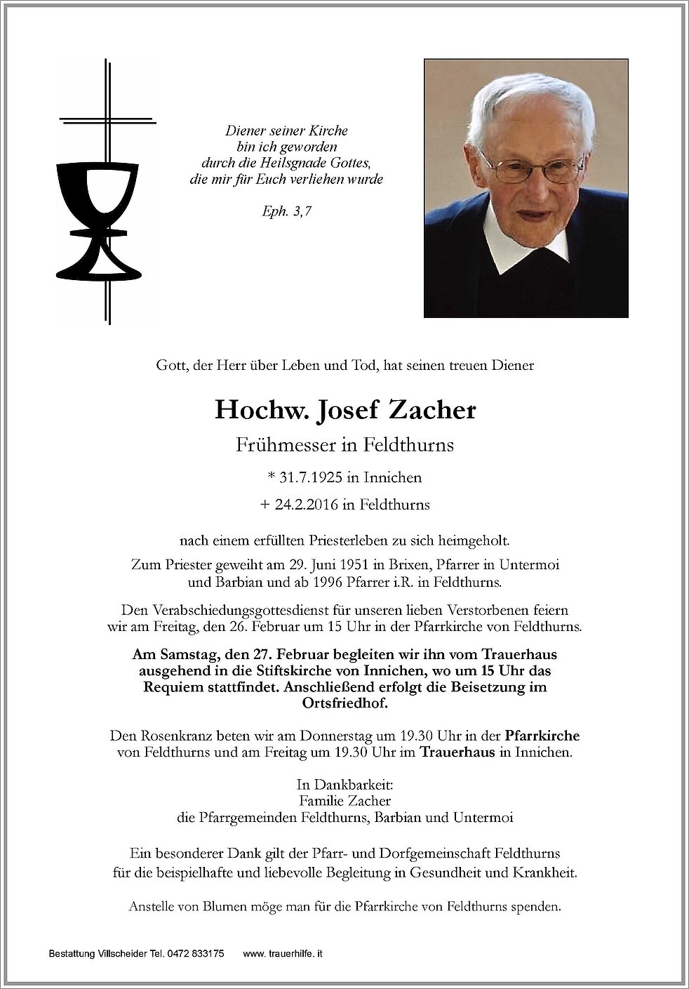 Anstelle von Blumen möge man für die Pfarrkirche von Feldthurns spenden.