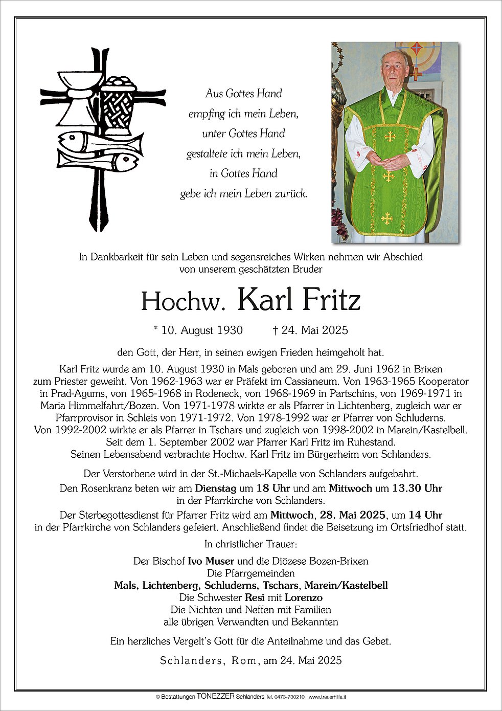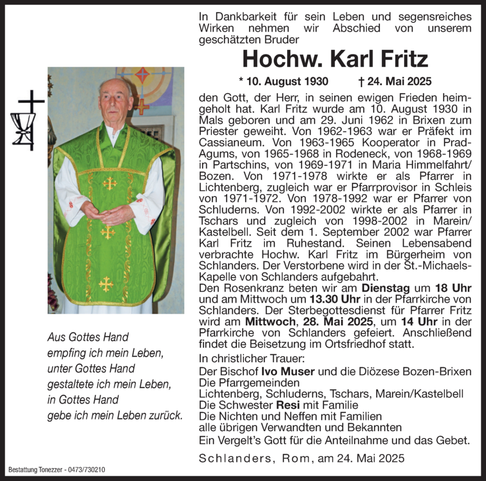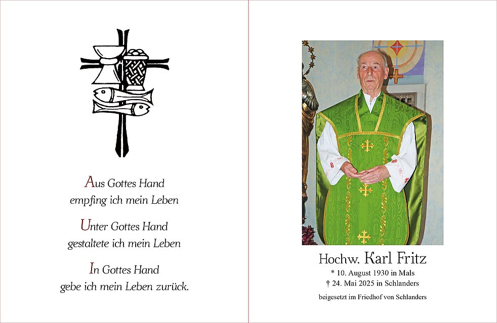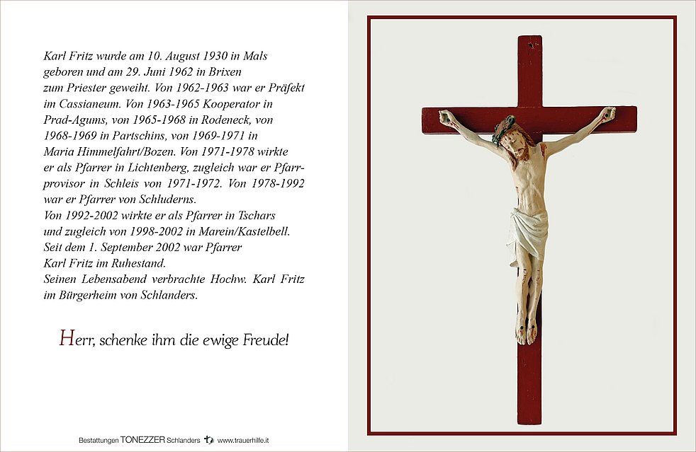 Begräbnisgottesdienst: 28.05. - 14:00 Uhr Pfarrkirche von Schlanders